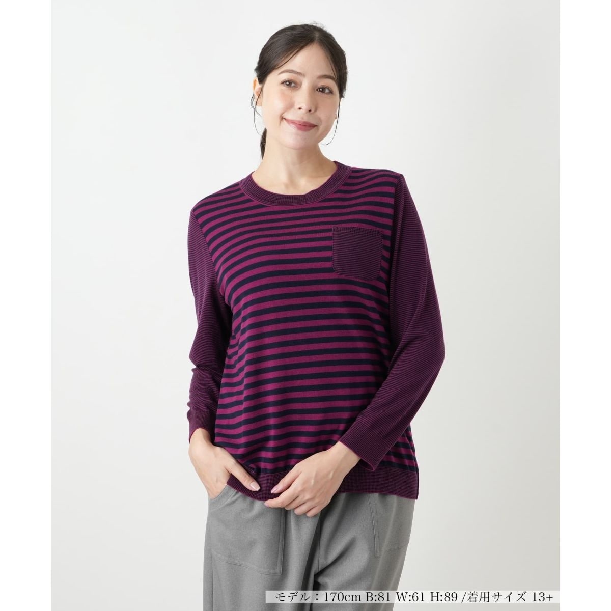 上品なボーダー柄が魅力の、長袖ニット。キュプラと毛をブレンドした素材は、しなやかで心地よい肌触りです。ノーカラーの丸首デザインは、デコルテラインを美しく見せ、アクセサリーも引き立てます。ご自宅で手洗いできるウォッシャブル仕様で、日常のお手入れも簡単。一枚で着ても、インナーとしても上品に映える、大人の女性のための着回し力の高いアイテムです。秋のコーディネートに軽やかなアクセントを添える、心地よさとデザイン性を兼ね備えた一枚です。