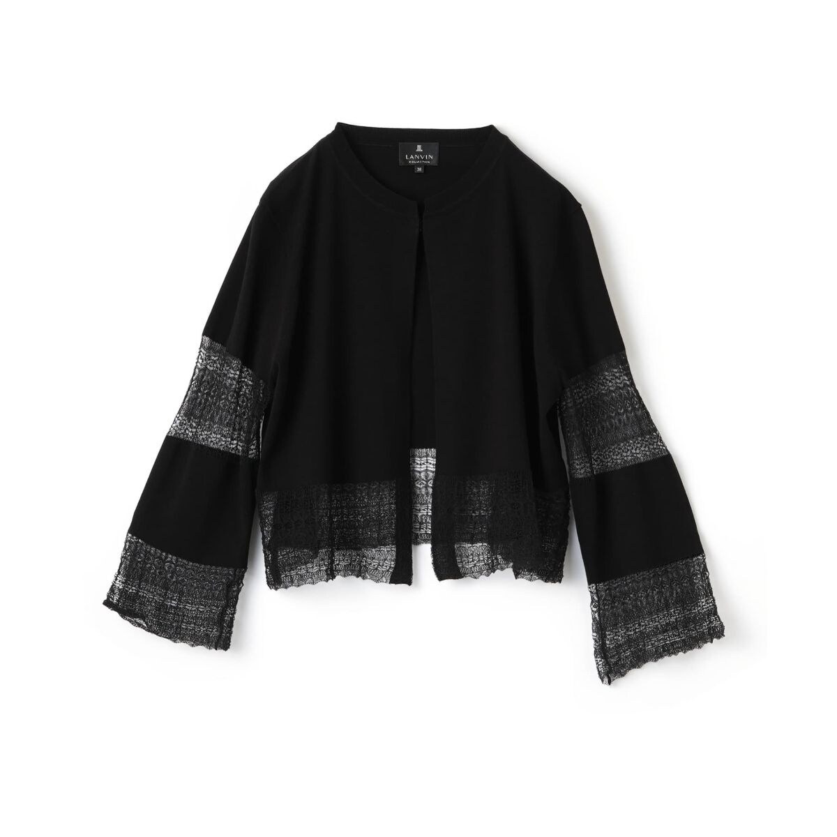 袖と裾に繊細なレースをあしらった、レース切替ニットカーディガン。