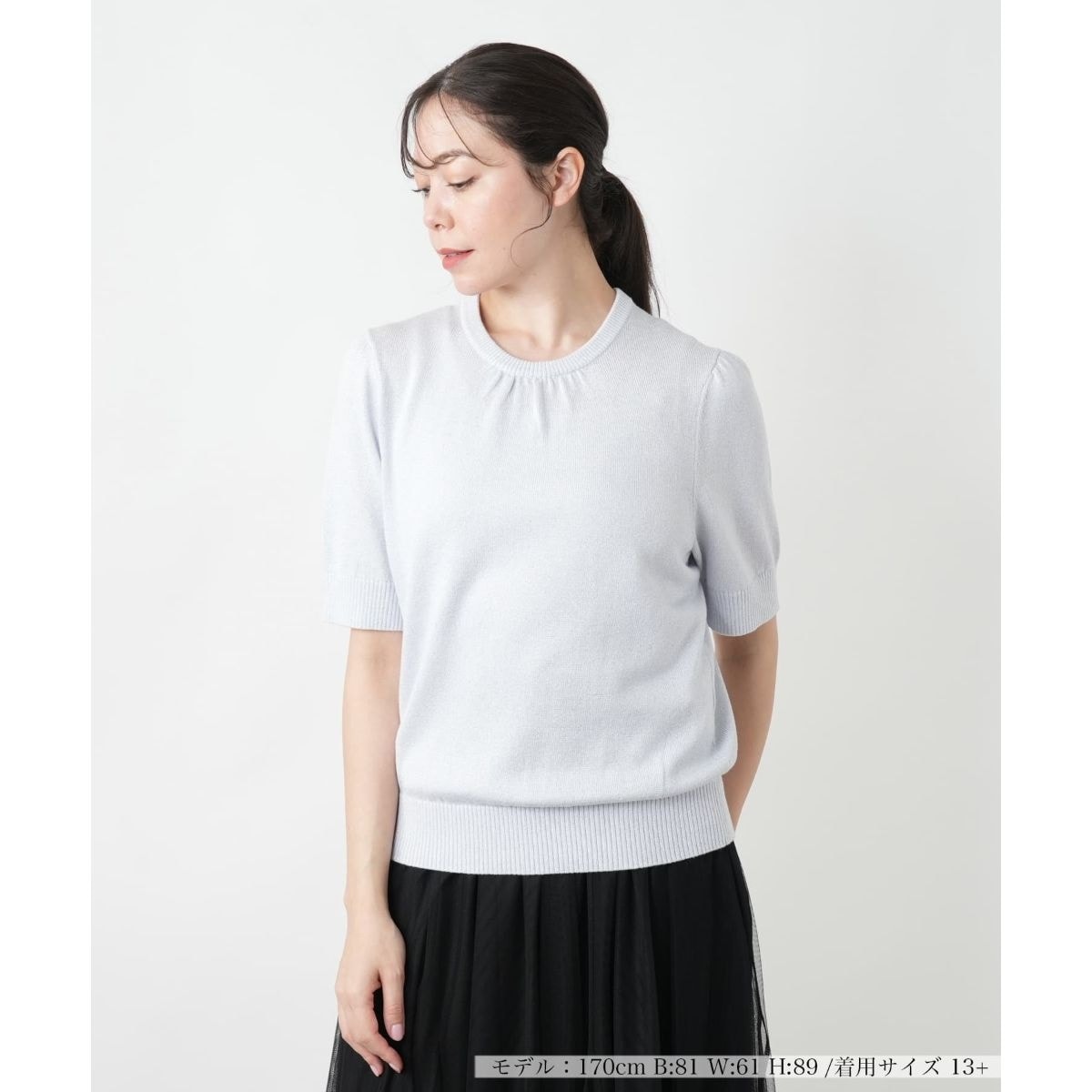 ほんのりとラメが煌めく、上品なハイゲージ編みのクルーネックニットプルオーバー。細やかな編み目が生み出す滑らかな質感と、すっきりとしたシルエットが、カジュアルな中にも洗練された大人のスタイルを演出します。ネック周りには繊細なギャザーを施し、柔らかなニュアンスをプラス。タイトすぎず程よくゆとりをもたせた着心地で、コーディネートするボトムスを選ばず着回しやすいトップスです。