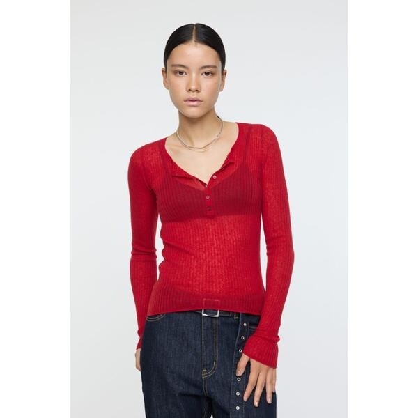 【SHEER HENRY NECK KNIT TOP / シアーヘンリーネックニットトップス】■ポイント&ディテール上質な羊毛とカシミヤをブレンドしたリブニットトップス。柔らかく滑らかな肌触りで、快適な着心地を叶えます。シアーな透け感とフィット感のあるシルエットが女性らしさを引き立て、デコルテを美しく見せるヘンリーネック仕様で抜け感をプラス。フロントに並ぶ小さなボタンが、シンプルなデザインにさりげないアクセントを添えています。■スタイリング1枚で着ればインナーとのコントラストを楽しめ、センシュアルな印象に。2色をレイヤードしても◎。スラックスと合わせて洗練された雰囲気に、またデニムと合わせればカジュアルな中にも品のある着こなしが楽しめます。■生地透け感:無裏 地:無伸縮性:有光沢感:無洗濯絵表示をご確認の上、クリーニングをお願いいたします。洗い方法を間違えますと大きい縮み、型不良が必ず起きますので、注意ください。着用していくうちにピリングが発生します。洗濯絵表示を確認頂き、内容の確認をお願いいたします。■商品のお気に入り登録お気に入りアイテムの再入荷・在庫1点などの通知を受け取ることができます。■ブランドのお気に入り登録新作アイテムの入荷や人気アイテムの再入荷、おすすめトピックスなど、いち早くブランドの情報を受け取ることができます。[注意事項]※画像の商品はサンプルです。実際の商品と仕様、加工が若干異なる場合があります。※画像の商品は光の照射や角度、お使いのモニター環境により、実物と色味が異なる場合がございます。※着用、お取り扱いの際は、アテンションタグをご確認ください。