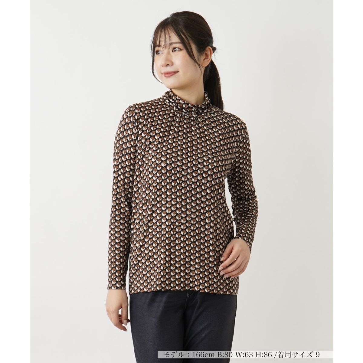 オプティカルな幾何学柄をプリントした、ハイネックカットソー。ネック周りにはナチュラルなドレープ感があり、柔らかなニュアンスに仕上がります。すっきりとしたシルエットでコーディネートしやすく、一枚での着こなしはもちろん、ジャケットやコートのインナーとしても活躍。しっとりとした優しい風合いのレーヨンベースの生地を使い、程よくストレッチが効いているので着心地も快適です。