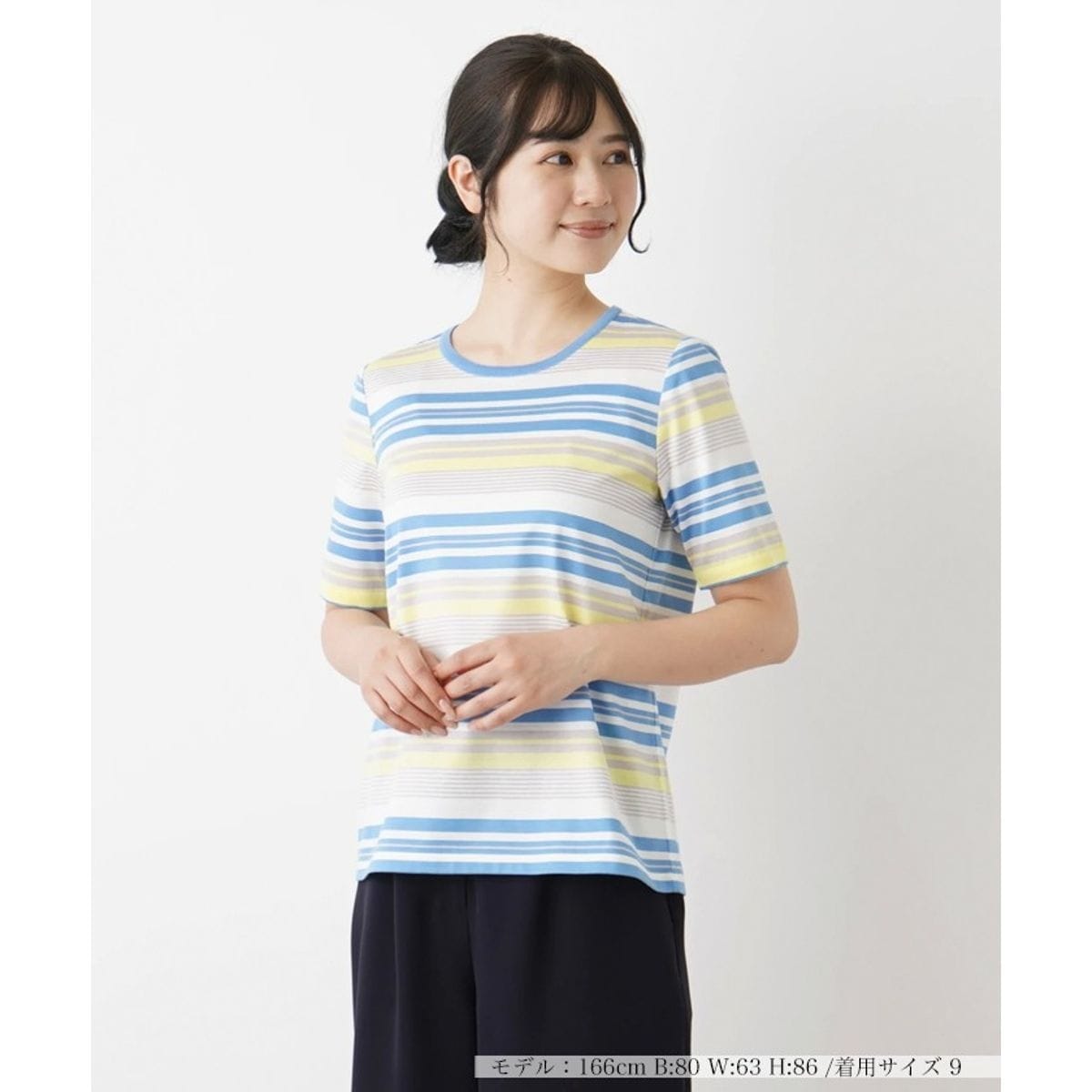 明るく爽やかなマルチボーダーが彩るクルーネックカットソー。形よく開いたネックラインがデコルテを覗かせ、ヘルシーな印象を演出。すっきりとしたシルエットで着こなしやすく、カジュアルな中にも大人の女性らしい上品さを感じさせる仕上がりに。肌当たりのよい優しい風合いのコットン生地を使い、快適な着心地を叶えました。スポーティなパンツでまとめるのはもちろん、フェミニンなスカートとのコーディネートもバランスよく決まります。