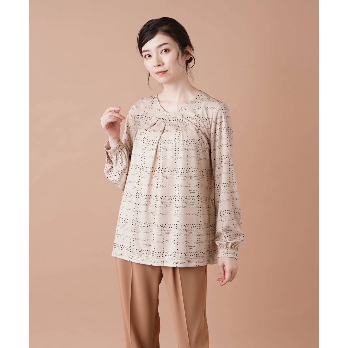 清楚かつフェミニンな印象を与えるVネックカットソー。生地表面に細やかな模様を組み合わせることでアーティスティックなチェック柄を描き出しています。フロントには広がるようにタックを施し、立体感のある美しいシルエットを構築。袖には程よくゆとりをもたせ、柔らかな雰囲気に仕上げました。バックネックの涙あきはループボタンにより開閉が可能。ベーシックなボトムスでまとめるのはもちろん、同柄のスカートを合わせたコーディネートもオススメです。