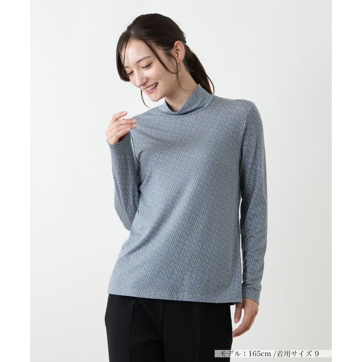レトロモダンな雰囲気が漂う、細やかな幾何学柄のハイネックカットソー。しなやか生地で伸縮性にも優れ、心地よく身体にフィットします。一枚での着こなしはもちろん、ジャケットやニットのインナーとして首元から柄を覗かせればぐっとおしゃれな印象に。いつものコーディネートにプラスするだけで、これからの季節のコーディネートを新鮮にアップデートしてくれる主役級のトップスです。