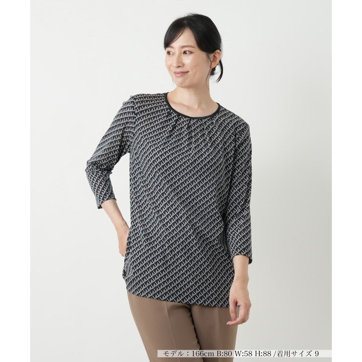 伸縮性に優れた肌当たりのよいパワーネット生地に、シャープな幾何学柄をプリントしたカットソー。程よい透け感とさらりとした軽い着心地が特徴です。首元に無地のトリミングを施し、全体の印象を引き締めるアクセントに。すっきりとしたシルエットでコーディネートしやすく、ジャケットのインナーとして柄を覗かせたり、キャミソールとの重ね着を楽しんだりと、レイヤードスタイルで活躍します。