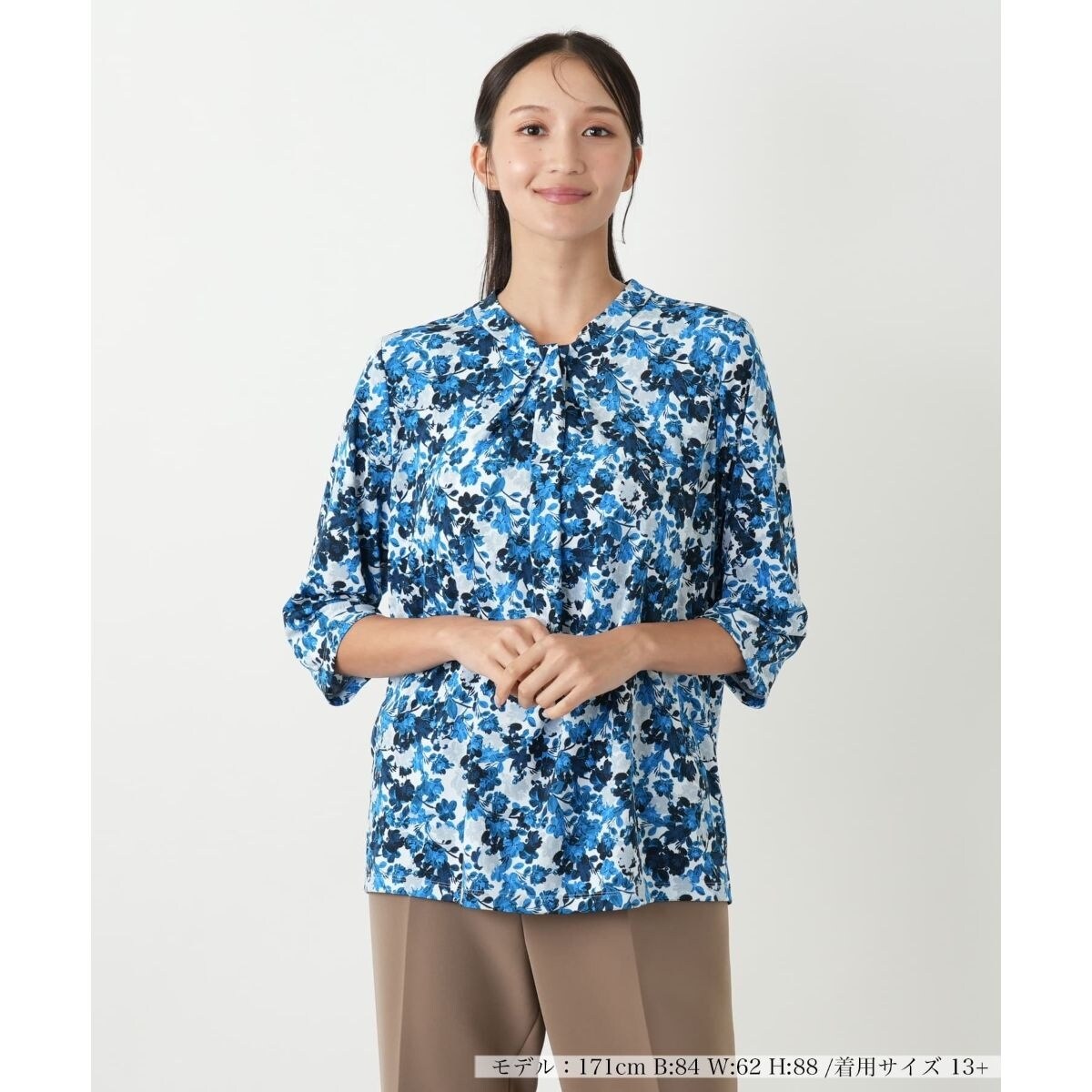 華やかな花柄が目を引くカットソーです。顔周りを明るく彩り、着るだけで優雅な雰囲気を演出します。七分袖ですので、季節の変わり目に快適に着用でき、軽やかな印象も与えます。一枚でコーディネートの主役になるのはもちろん、ジャケットやカーディガンのインナーとしても活躍します。ご自宅で手洗いができるウォッシャブル仕様で、お手入れも簡単に行えます。デイリーユースから、ちょっとしたお出かけまで、幅広いシーンにフィットするおしゃれな一枚です。
