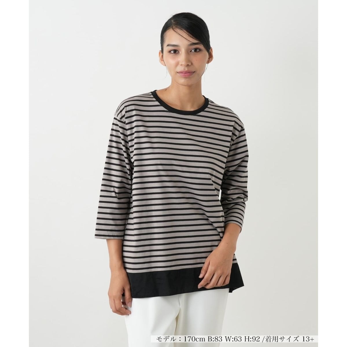 定番のボーダーカットソーを、裾の異素材切り替えでアップデートしたトップス。シンプルな無地の軽やかな素材をドッキングさせることで、一枚でこなれた重ね着風スタイルが完成します。腰回りをさりげなく隠してくれる、計算された着丈も嬉しいポイント。ベース部分は伸縮性のある柔らかな生地で着心地も抜群。細身のパンツを合わせるだけで様になる、デイリーユースに頼れるアイテムです。