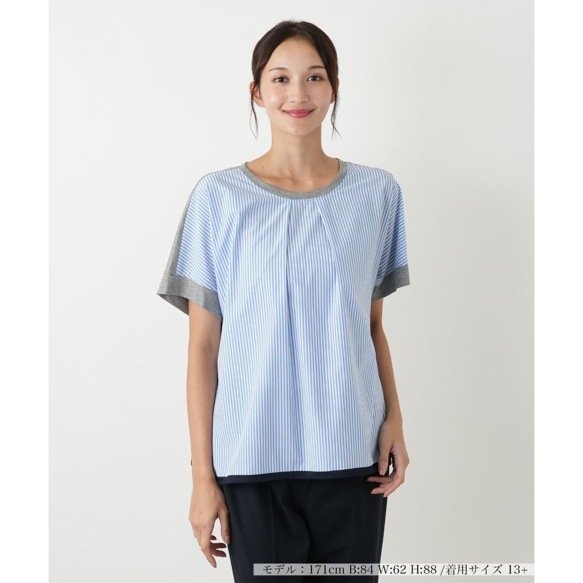 爽やかなストライプ柄と異素材の組み合わせが新鮮な、初秋にぴったりのブラウス。前身頃は清涼感のあるストライプで、タックを施すことで立体感をもたせ、ゆったりとした着心地を実現しました。後身頃は伸縮性のある素材を使用し、快適に着用できるように配慮されています。裾にはドローコードがあしらわれており、シルエットを自由に調節可能。コーディネートや気分に合わせてアレンジを楽しめます。やや薄手の生地は、残暑が残る初秋にも心地よく、さらりと快適に着用いただけます。