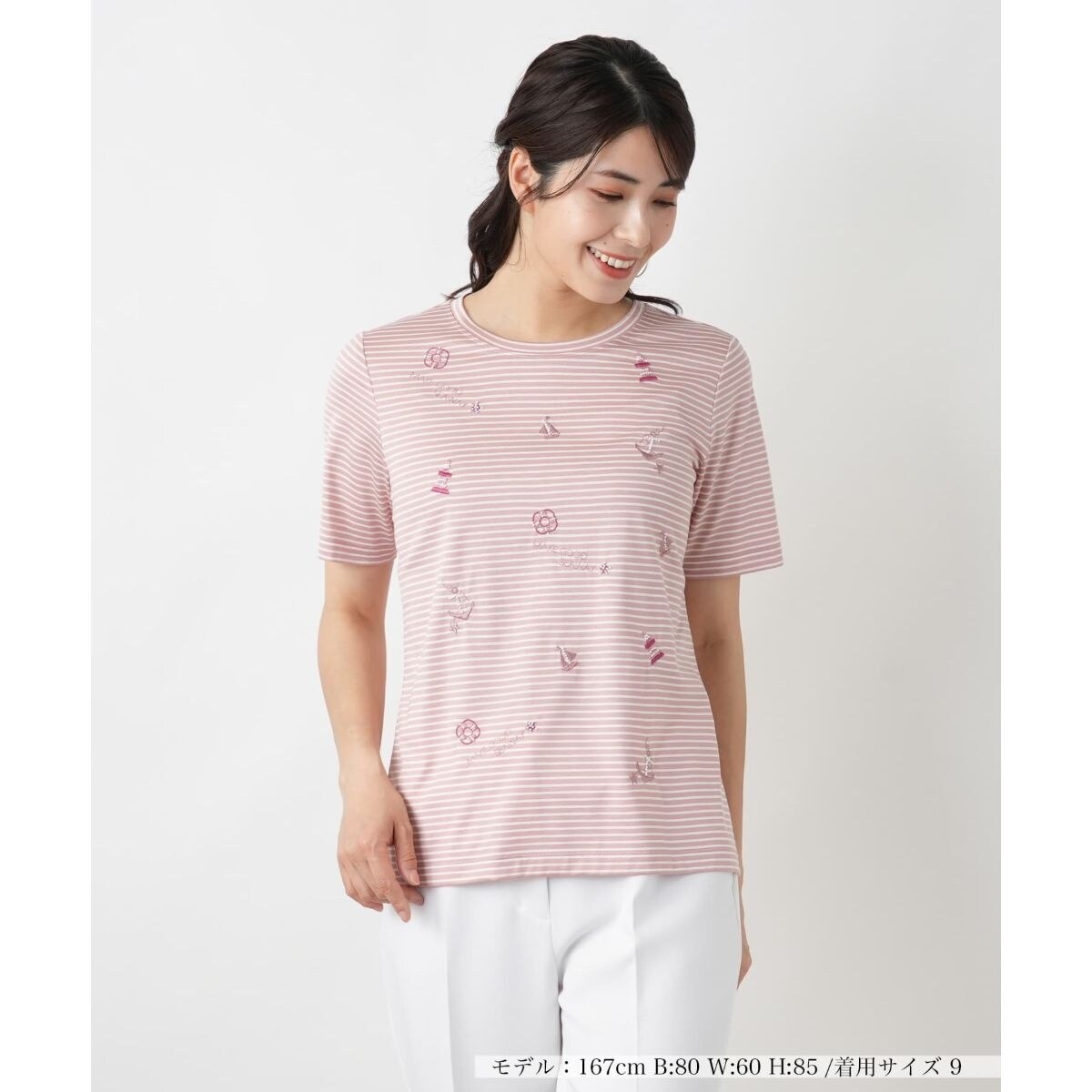 細めのボーダーに、灯台やヨット、アンカーなどユニークなマリンモチーフの刺繍&ビーズを散りばめた、夏らしいアクセントが効いたTシャツ。ネックラインは程よく開きをもたせて、顔まわりをすっきりと見せつつスマートな印象に。柔らかく肌になじむコットン素材を使用し、デイリーに嬉しい快適な着心地もポイント。パンツと合わせてアクティブに、スカートと組み合わせてほんのりフェミニンに。コーディネート次第でさまざまな表情が楽しめる、夏のワードローブにぴったりのアイテムです。