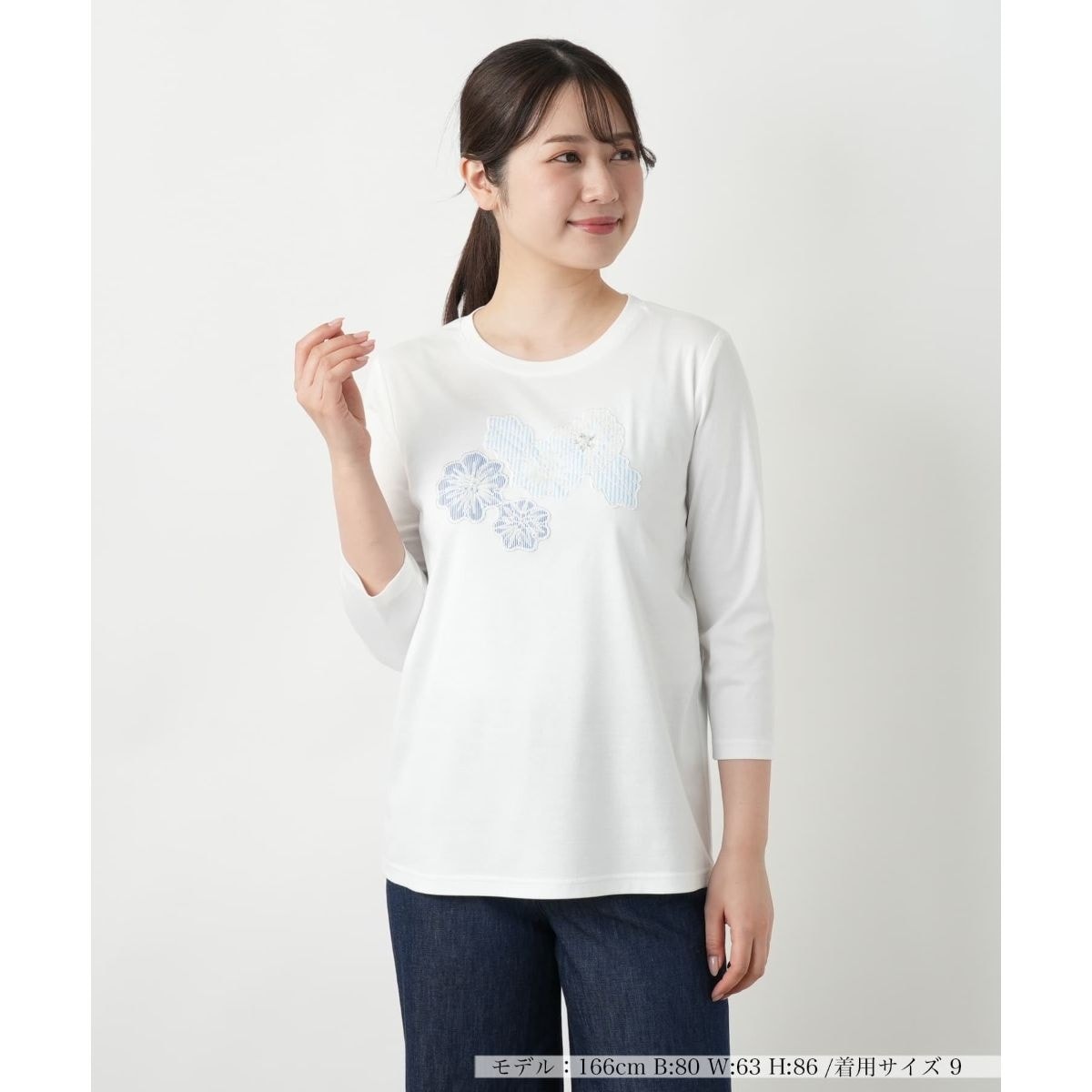 フラワーモチーフの刺繍が目を惹く、七分袖カットソー。ストライプを効かせた花々に、ビジューのさりげない輝きを添えて、大人の可愛らしさを引き立てています。肌当たりのやさしいコットンを使い、程よくフィットするすっきりとしたシルエットでデザインしました。一枚ではもちろん、ジャケットやカーディガンのインにも重宝します。パンツでシンプルにまとめても、スカートと合わせて優しげに仕上げてもバランスよくスタイリングできます。
