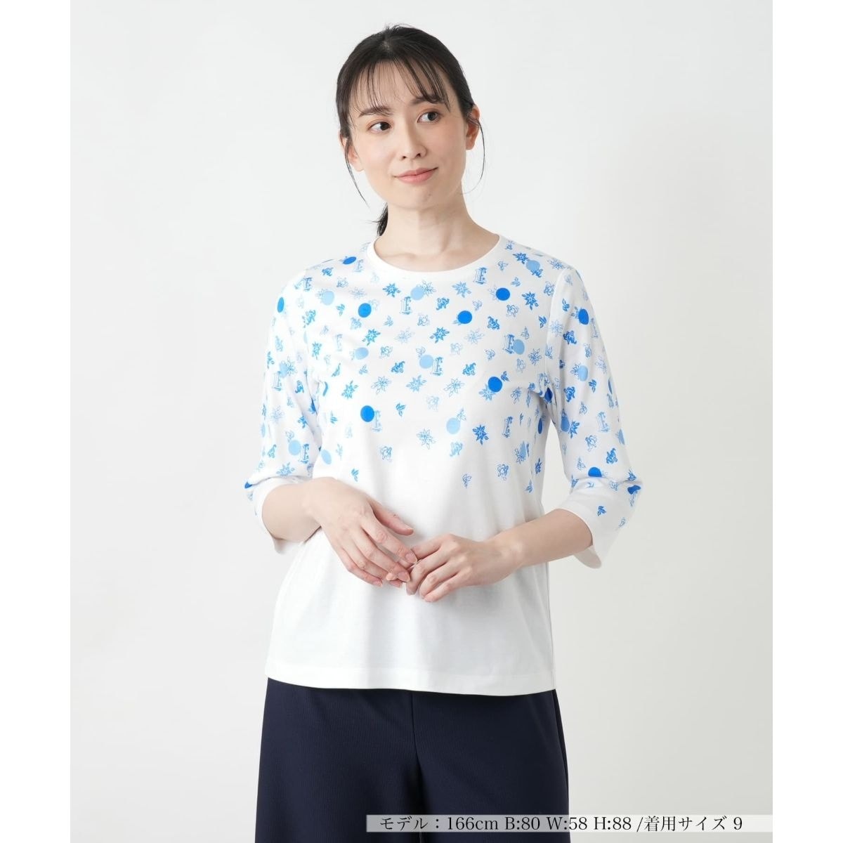 イニシャルモチーフや大粒のドット、繊細なボタニカル柄が絶妙に組み合わさった、遊び心溢れるデザインのクルーネックTシャツ。まとまりのある配色で上品な印象に仕上げました。軽やかなクロップドスリーブが抜け感を生み出す、春夏のスタイリングにぴったりの一枚。肌に心地よく寄り添う柔らかなコットン生地を使い、さらっと快適な着心地を実現しました。パンツにもスカートにも合わせやすく、カジュアルからきれいめまで幅広いコーディネートで活躍します。