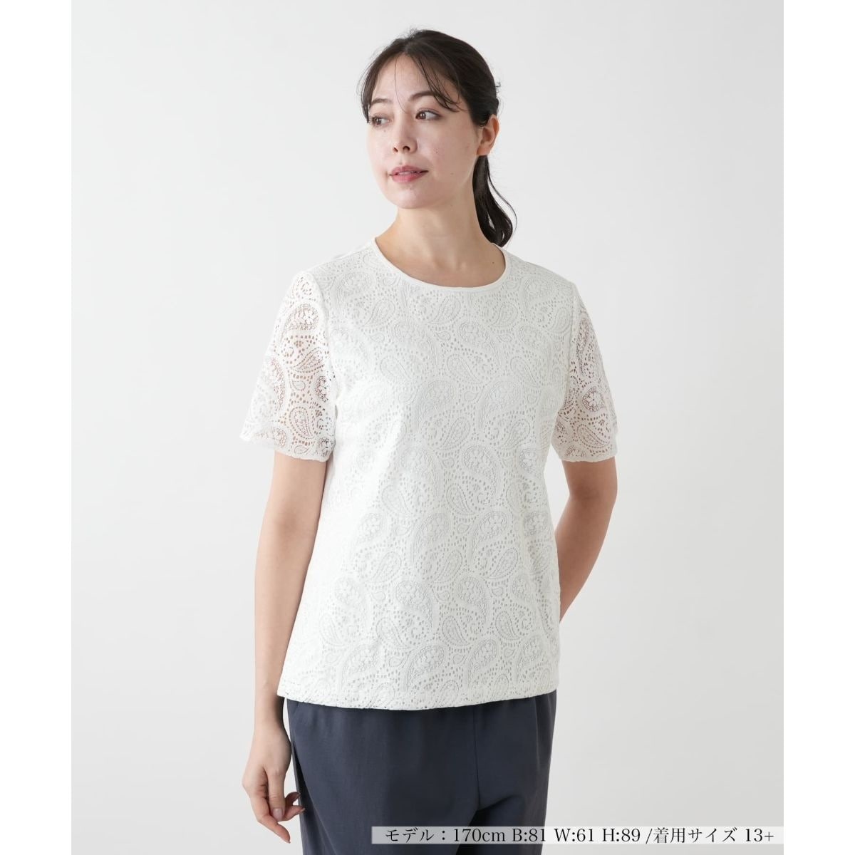 ペイズリー模様のレースを贅沢にあしらったカットソー。フロントからスリーブまでレース仕立てにすることで、華やかさと軽やかさを演出しました。統一感のある上品なワントーンデザインで、シンプルながらも存在感のある一枚に。ネックラインはすっきりと仕上げ、さりげない抜け感をプラス。デニムと合わせてカジュアルに、フレアスカートでフェミニンにまとめるなど、ボトムス次第で幅広いスタイリングにマッチ。ジャケットのインナーとしてもおすすめです。