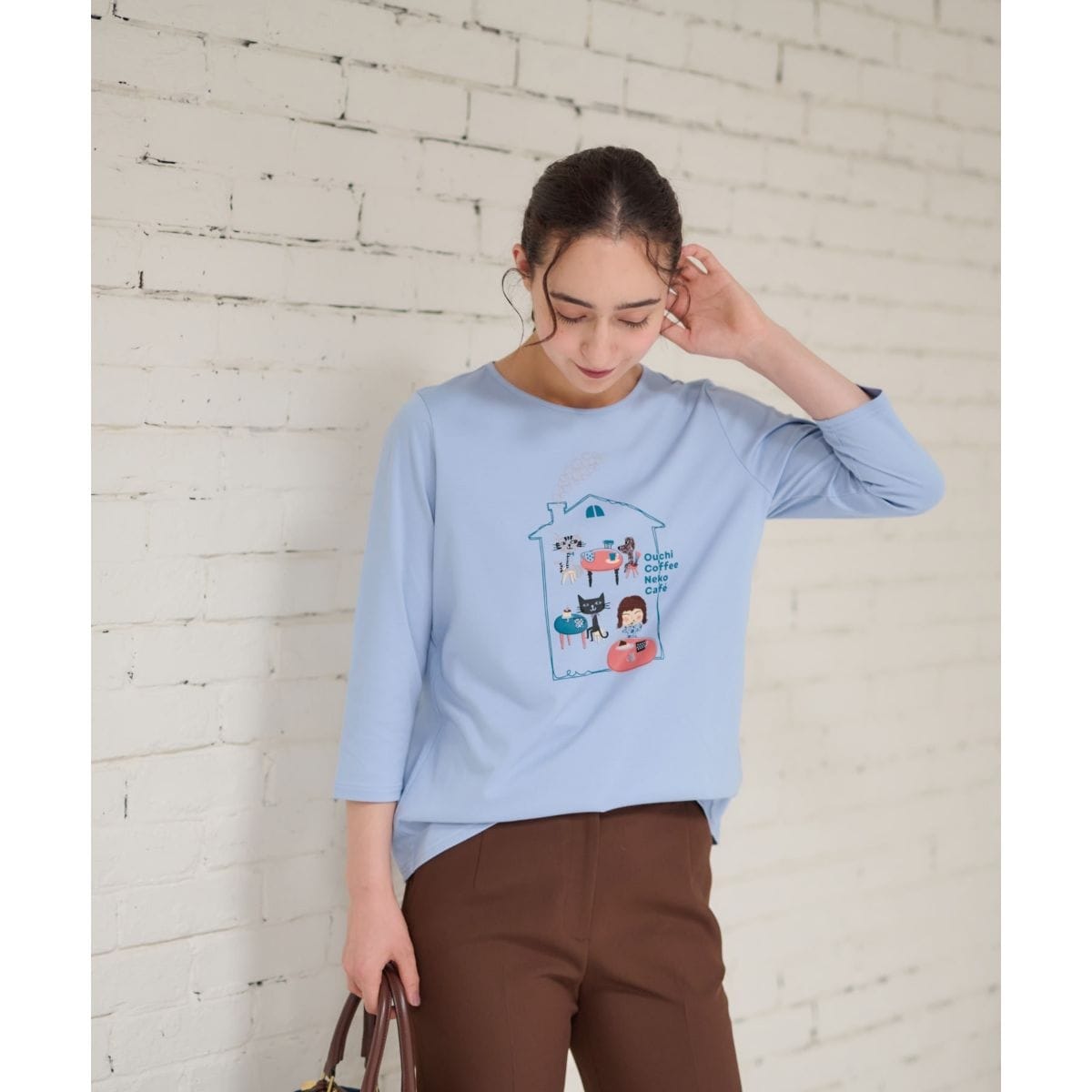 可愛らしい猫カフェの楽しい雰囲気をユーモラスに描いた七分袖カットソー。眺めているだけで微笑みが誘われるデザインは、日常にちょっとした癒しと遊び心をプラスしてくれる一枚。ネックラインはゆったりと開き、絶妙なバランスの抜け感を演出。やや薄手の柔らかなコットン生地を使い、リラックス感のある着心地を叶えました。ボトムスを選ばずにコーディネートしやすく、着回し力にも優れています。