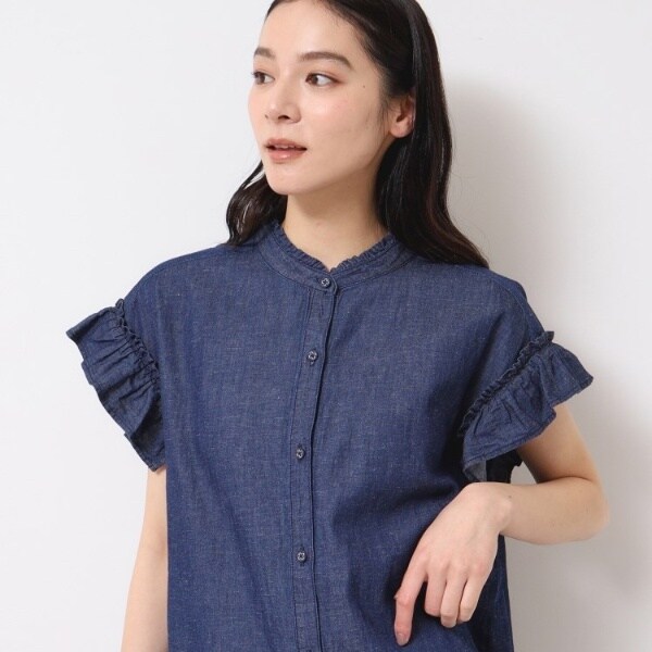 袖と襟もとにフリルをデザインしたデニムブラウス。