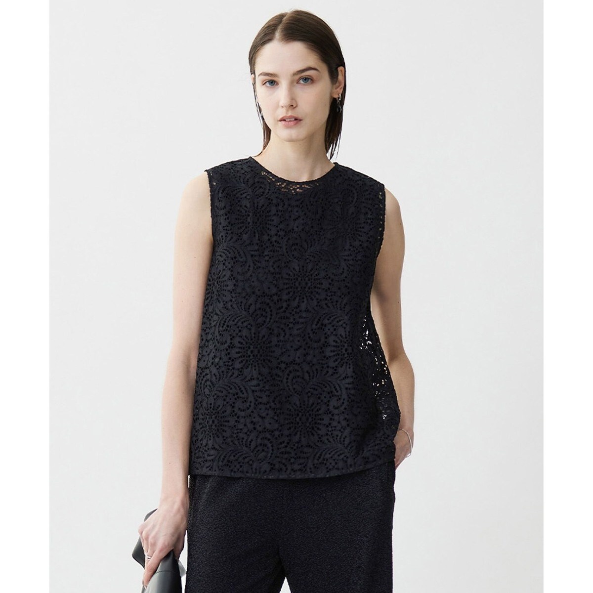 ■デザインデイリーなコーディネートをアップデートする、総レースブラウスです。スリーブレスかつ涼しげなレースをオールブラックで表現することで、ICBらしいクールなムード漂う一着に仕上げました。インナーに黒を合わせた統一感のあるクールな雰囲気から、白と合わせてコントラストをつけることで柄の際立つ華やかな雰囲気まで、インナーによって様々な顔を見せてくれる特別な一着です。