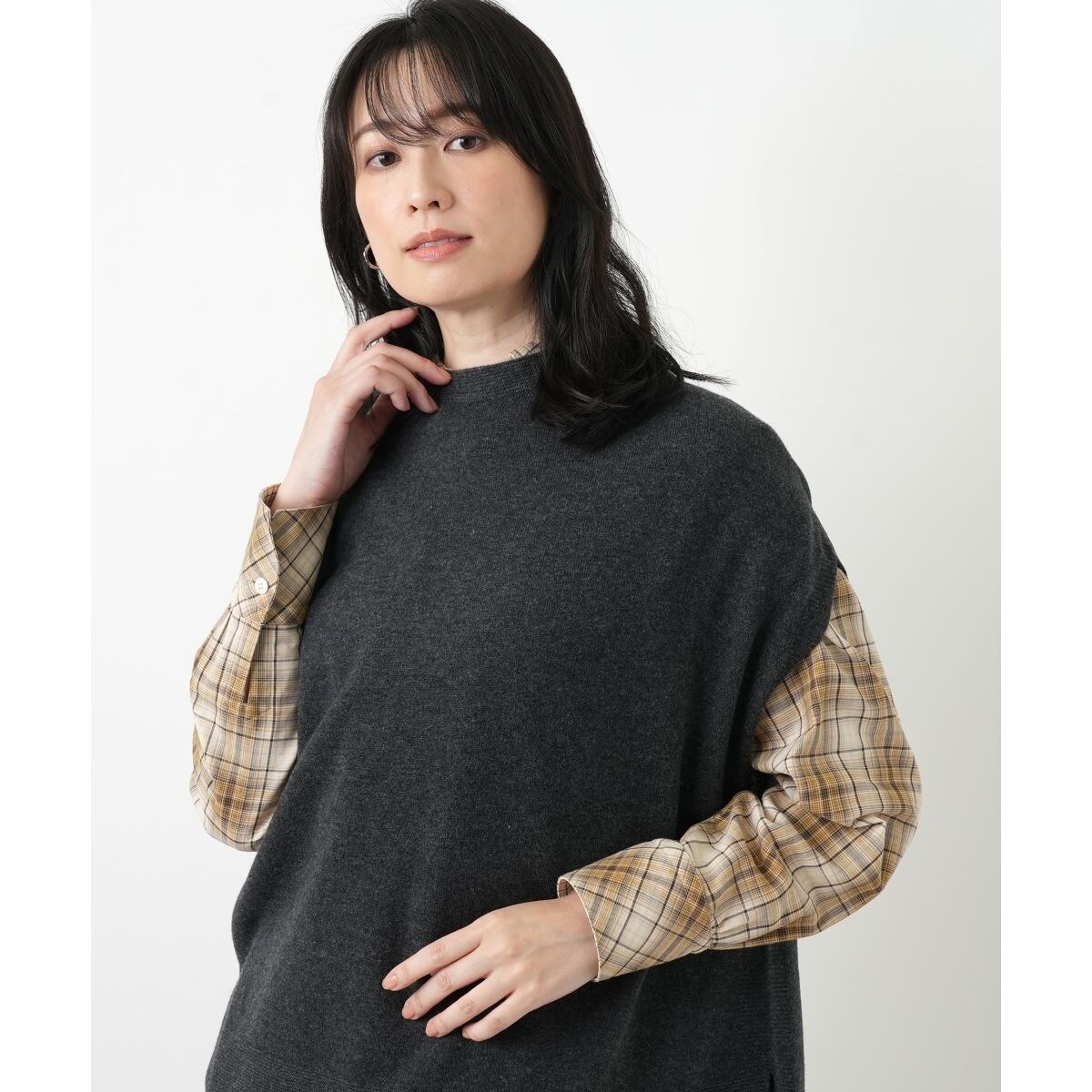 いつものコーディネートに重ねるだけで、旬のレイヤードスタイルが完成するボトルネックニットベスト。ゆったりとしたシルエットと深めのサイドスリットが、着こなしに軽やかな抜け感を作り出します。しなやかなハイゲージニットでシャツやカットソーの上に重ねてもすっきり。ウエスト回りもさりげなくカバーしつつ、お洒落なバランスが叶います。これからの季節のワードローブにあると何かと重宝しそうなトップスです。
