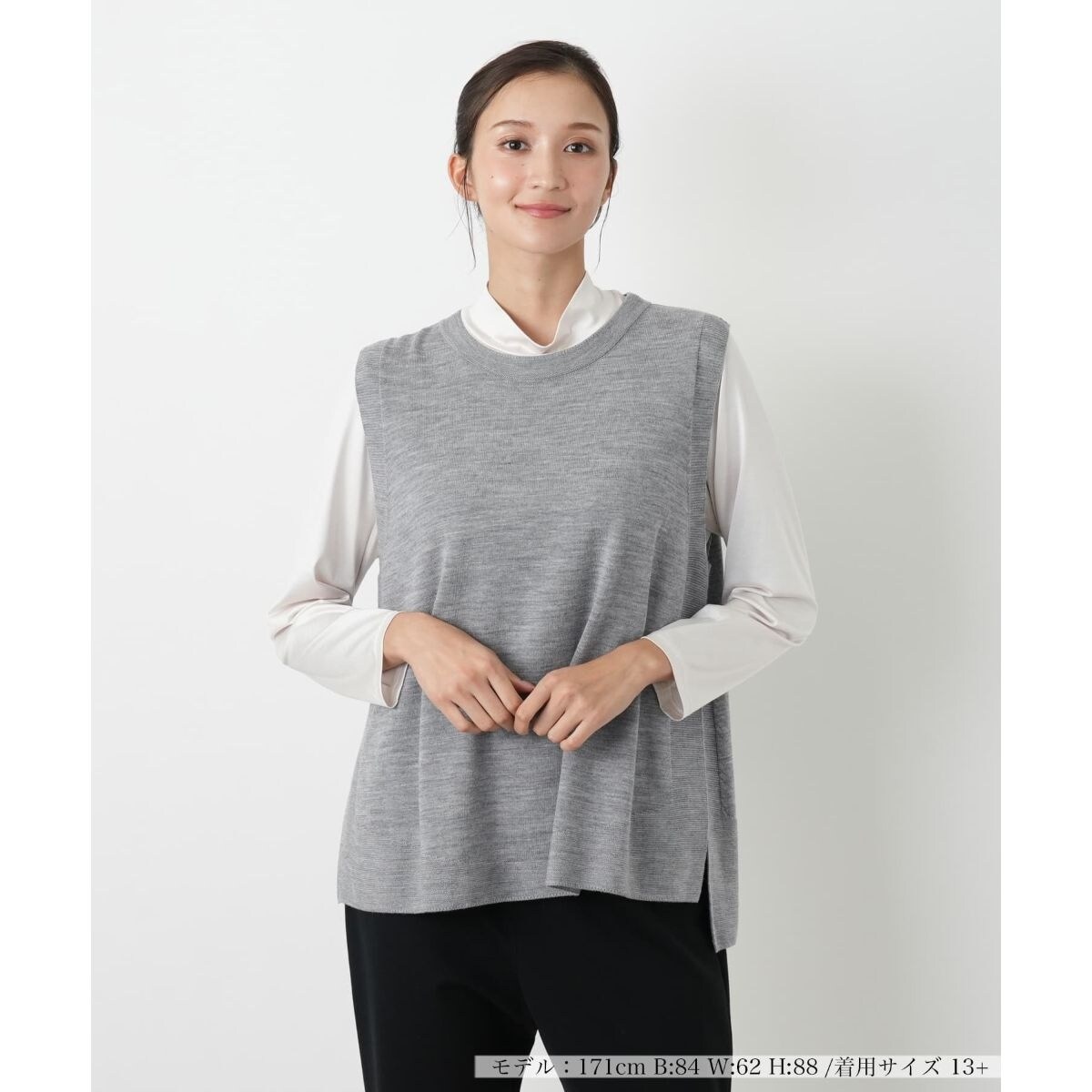 毛を100%使用した、暖かく柔らかな肌触りのベスト。ノーカラーの丸首デザインが、すっきりと洗練された印象を与え、様々なインナーとのレイヤードをお楽しみいただけます。シンプルな無地デザインながらも、素材の上品な質感と仕立ての良さが際立ち、大人の女性らしい品格を演出いたします。秋の始まりから冬にかけて、軽やかな羽織りとして、またジャケットやコートのインナーとして、長くご愛用いただけるでしょう。大人の女性の多様なライフスタイルに寄り添うアイテムです。