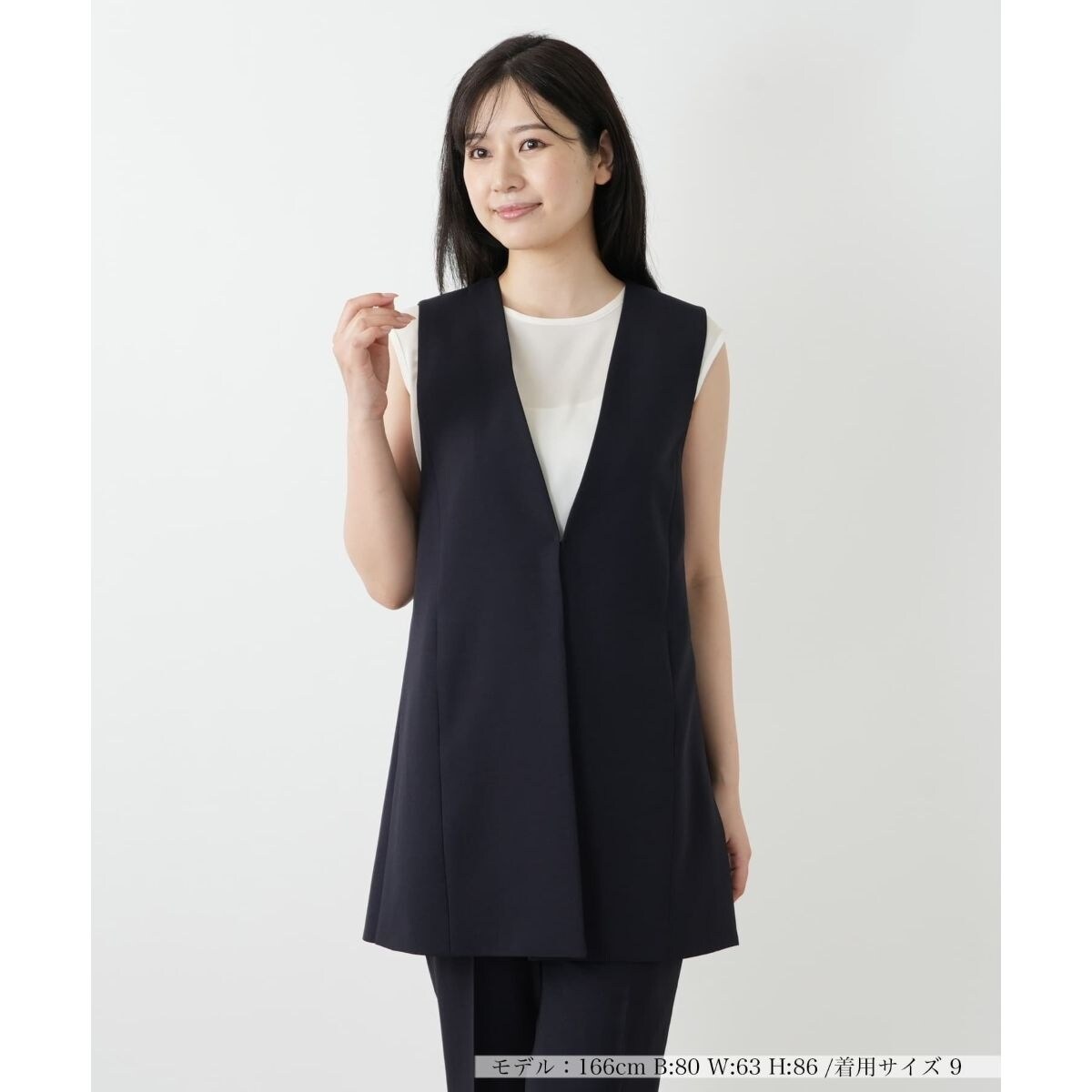 いつもの着こなしにプラスするだけで、ぐっと洗練された印象に仕上がるVネックロングベスト。シャープなネックとIラインシルエットが縦のラインを強調し、スタイルアップを叶えます。気になるヒップ周りを自然にカバーしてくれる着丈も嬉しいポイント。フロントは鍵ホックにより開閉が可能。Tシャツやブラウスにさっと羽織るだけで、これからの季節らしいこなれたレイヤードスタイルが完成します。同素材のパンツと合わせた、マニッシュなセットアップコーデもおすすめです。