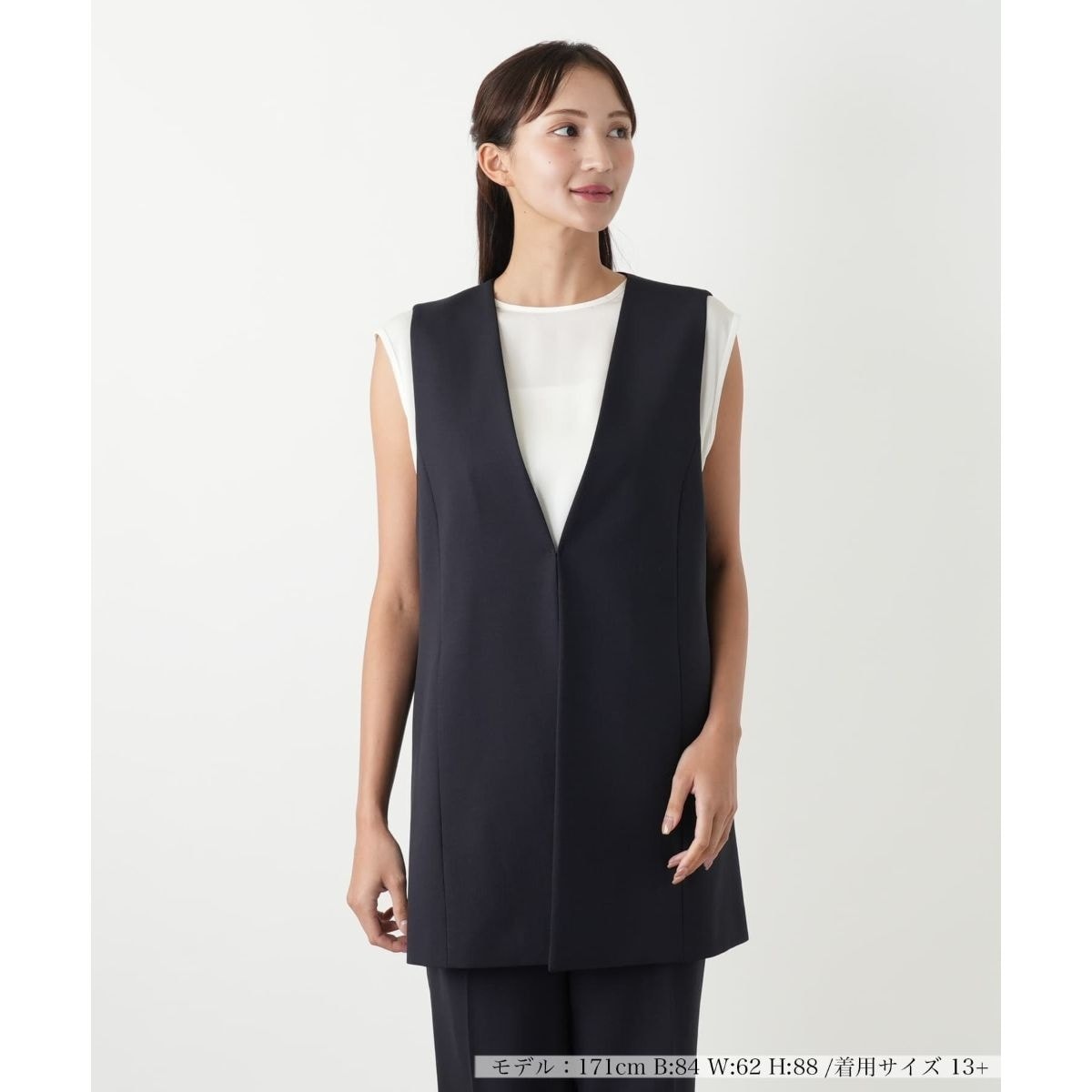 いつもの着こなしにプラスするだけで、ぐっと洗練された印象に仕上がるVネックロングベスト。シャープなネックとIラインシルエットが縦のラインを強調し、スタイルアップを叶えます。気になるヒップ周りを自然にカバーしてくれる着丈も嬉しいポイント。フロントは鍵ホックにより開閉が可能。Tシャツやブラウスにさっと羽織るだけで、これからの季節らしいこなれたレイヤードスタイルが完成します。同素材のパンツと合わせた、マニッシュなセットアップコーデもおすすめです。