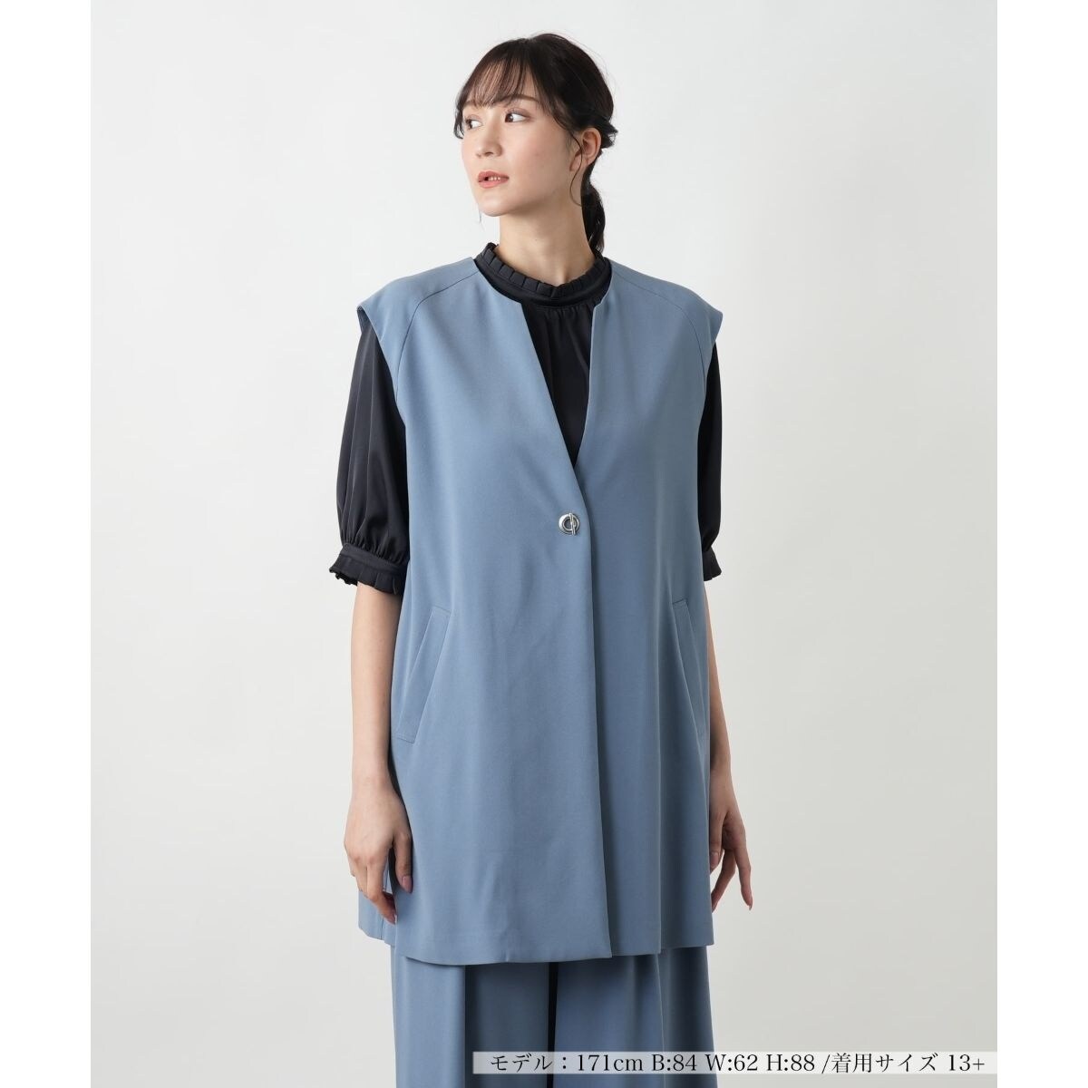 フロントのゴールドボタンがエレガントな印象を与え、Vネックラインがすっきりとしたシルエットを演出。適度なゆとりがありつつも、ストレートなラインがスマートな印象をプラスします。軽やかな素材感で、季節の変わり目にぴったりなアイテム。タートルネックやブラウス、ワイドパンツとの相性も良く、オンオフ問わず活躍する万能ジレです。