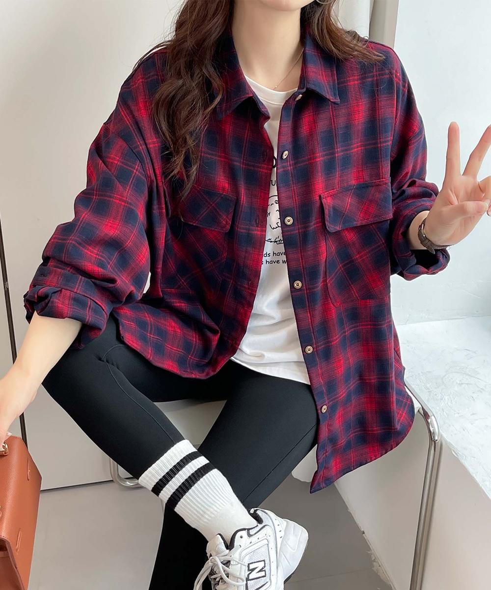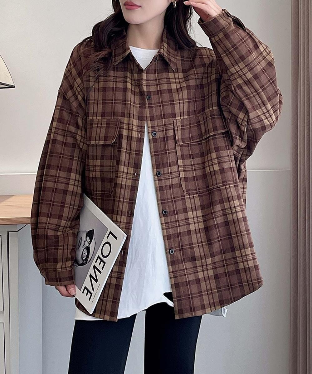 落ち着いた色合いのチェック柄が特徴的な長袖オーバーシャツです。ゆったりとしたシルエットで、リラックス感のある着心地。胸元のポケットがアクセントになっています。カジュアルスタイルにぴったりのアイテムです。
