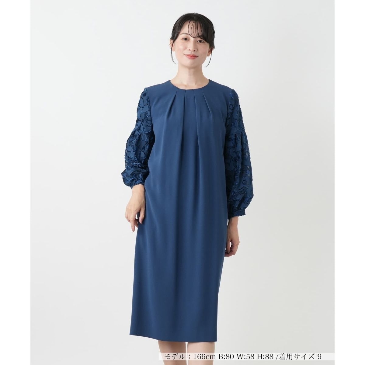 大人の女性らしいリュクスな雰囲気を漂わせる、タックワンピースがお目見え。繊細な刺繍レースで仕立てたボリュームスリーブが、所作まで美しく優雅に引き立てます。身頃はすとんと落ちる上品なシルエットで、気になるボディラインを拾わないのも嬉しいポイント。一枚でコーディネートが完成する主役級のアイテムは、結婚式やパーティーといったお呼ばれのシーンに最適です。バックファスナーにより開閉が可能。