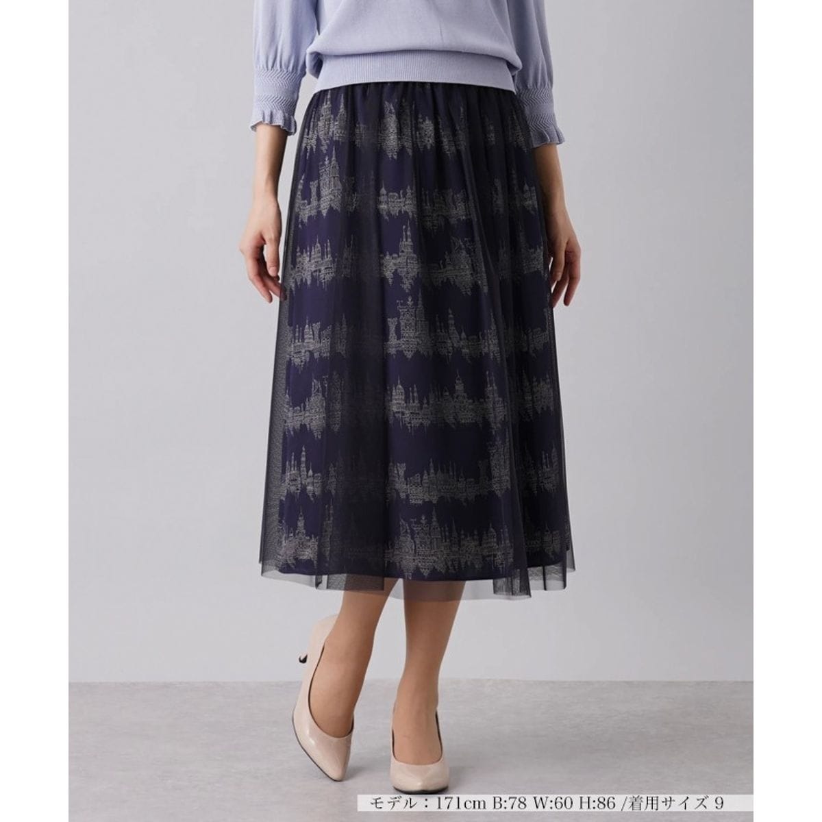 美しい様々なアーキテクチャーをモチーフにした総柄プリントのミディ丈スカートに、透け感たっぷりのオーバースカートを重ねた2枚セット。それぞれ単品でも活躍してくれるから、これ1着でスタイリングの幅が広がります。大人の女性らしいAラインシルエットでエレガントな佇まいに。