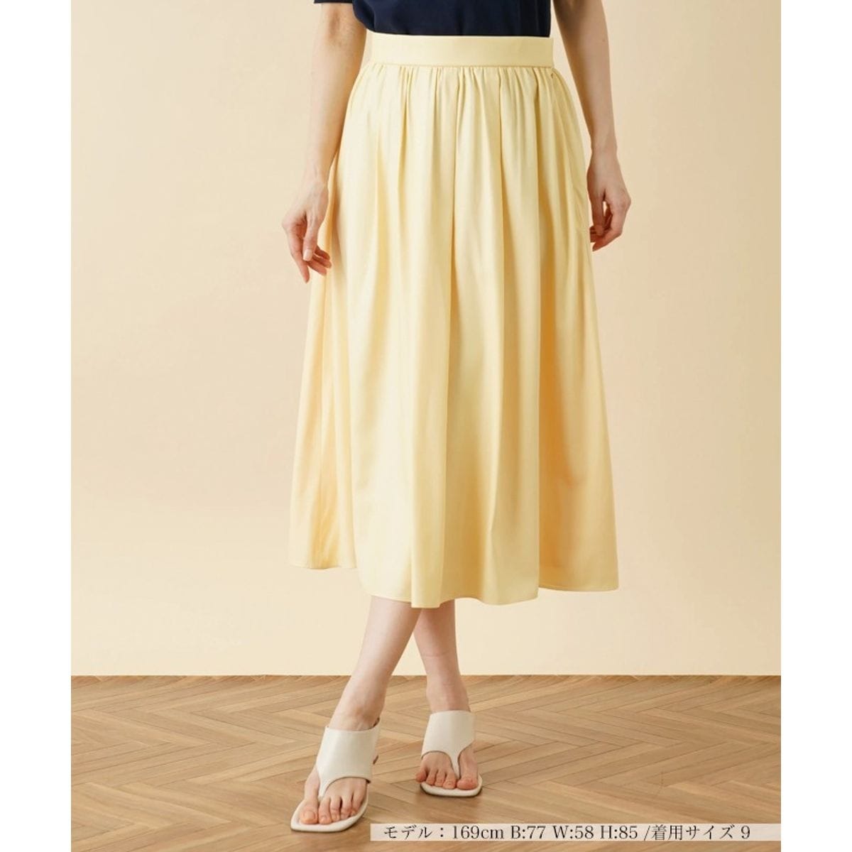シルキーな光沢感のある素材を使用したミディ丈のフレアスカート。ウエストをシェイプしつつ、裾に向かって広がりをもたせたシルエットがエレガントな女性らしさを引き立てます。ギャザーをたっぷりと施し、柔らかなニュアンスに仕上げました。バックウエストはゴム仕様で心地よいフィット感をもたせています。シンプルなトップスを合わせるだけで、旬のフェミニンルックが完成します。サイドホック&ファスナー開閉可能。