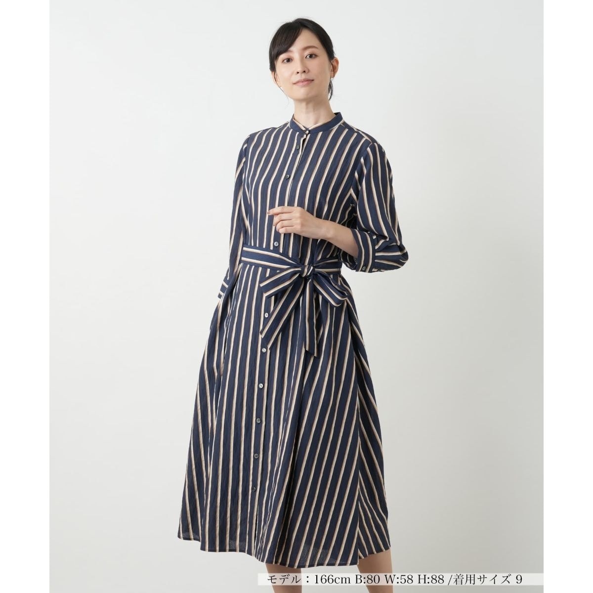 フランス「DEVEAUX(デヴォー)」社のレーヨン混素材を使用したワンピース。落ち感のある上品な光沢と豊かな表情感が魅力です。スカート部分にはタックを施し、裾に向かって優雅に広がるAラインシルエットを形成しています。七分袖とスタンドカラーが洗練された印象を与え、付属のベルトでウエストマークも可能。ウォッシャブルでお手入れも簡単です。