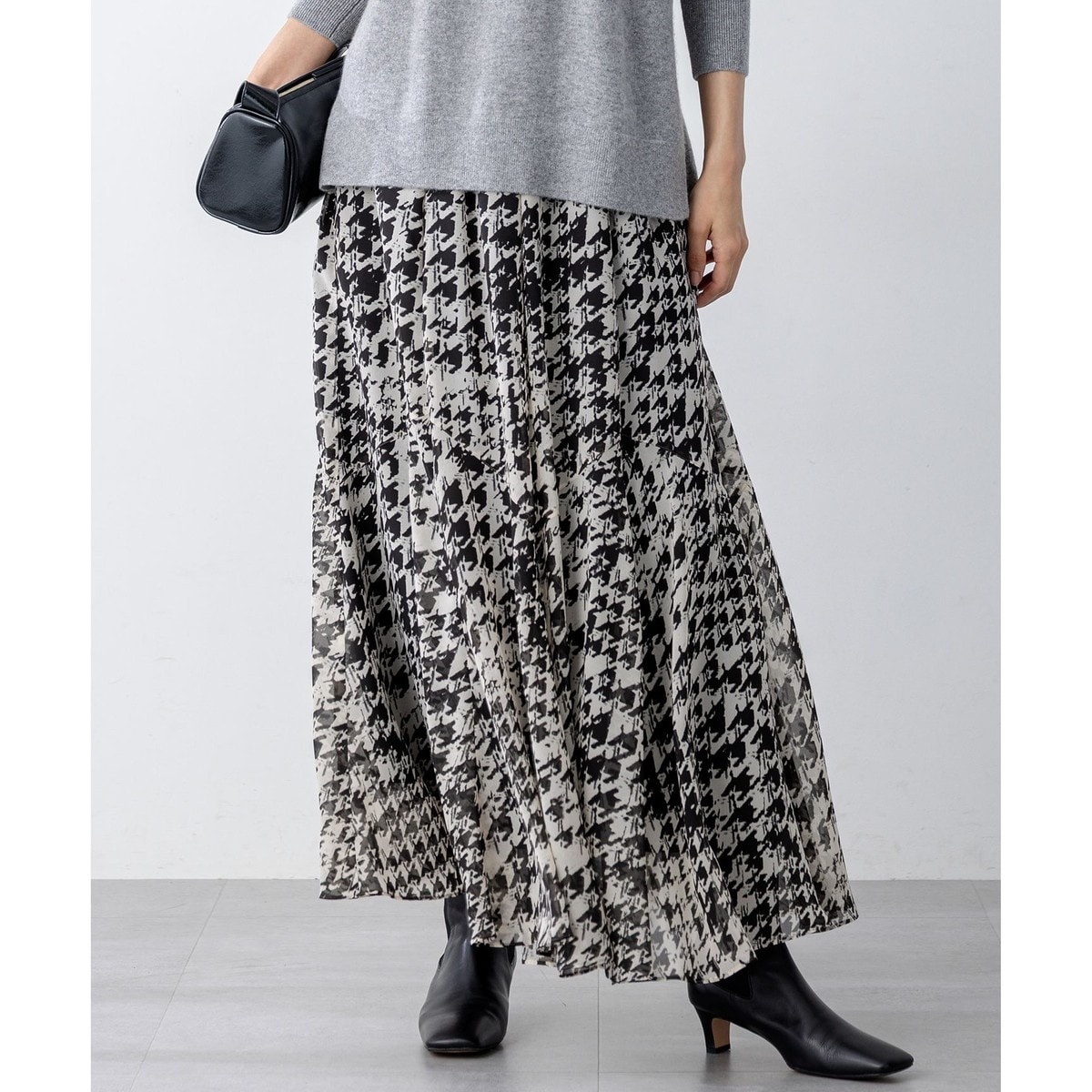 ニュアンスたっぷりの千鳥柄を使ったギャザーフレアスカート。裾に向かって広がるフレアが美しく、合わせるトップスを引き立ててくれる1枚です。腰回りは膨らみすぎない絶妙な分量感なのでウエスト周りをきれいにカバーしてくれます。ウエストの後ろはゴムギャザーで穿き心地もよく、シーズンレスで着用いただけるアイテムです。カラーは、モノトーンプリント(#505)の1色展開です。