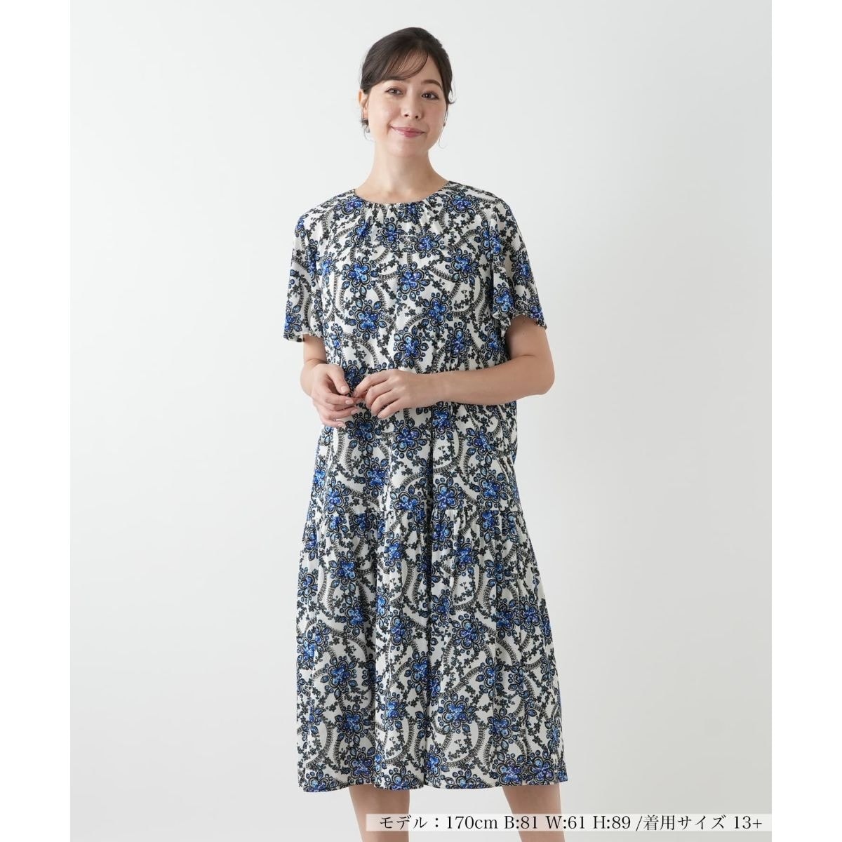 繊細なボタニカルプリントと、ふわりと揺れるシルエットが魅力のフレアワンピース。軽やかで伸縮性に優れたパワーネット素材で仕立てました。スカート部分の切り替えが優雅なドレープを生み出し、女性らしい柔らかなニュアンスを演出。気になる身体のラインを拾わないリラクシーな着心地が感じられる一枚です。シワになりにくく、旅行などにもおすすめです。