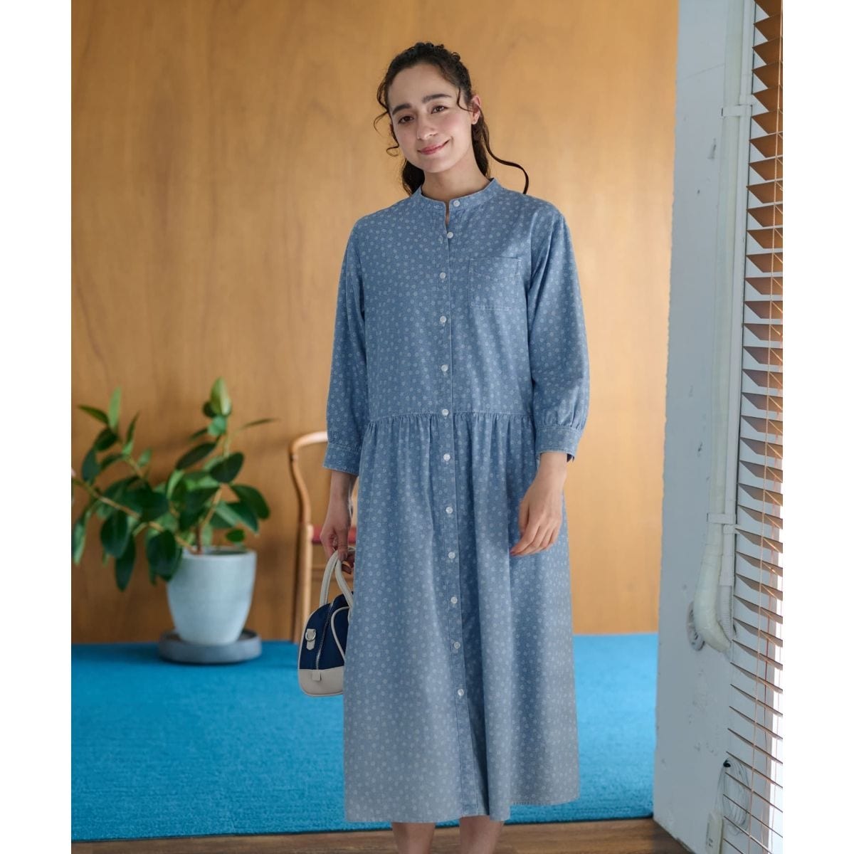 製品洗いとバイオブリーチ加工で仕上げたインディゴデニムの、風合い豊かな小花柄シャツワンピース。すっきりとしたバンドカラーと、低めの位置で切り替えたギャザースカートが、甘すぎない大人の可愛らしさを演出します。部分的にバランスよくギャザーを施すことで柔らかなニュアンスに。初秋のレイヤードスタイルにも活躍します。便利なサイドポケット付きなのも嬉しいポイントです。
