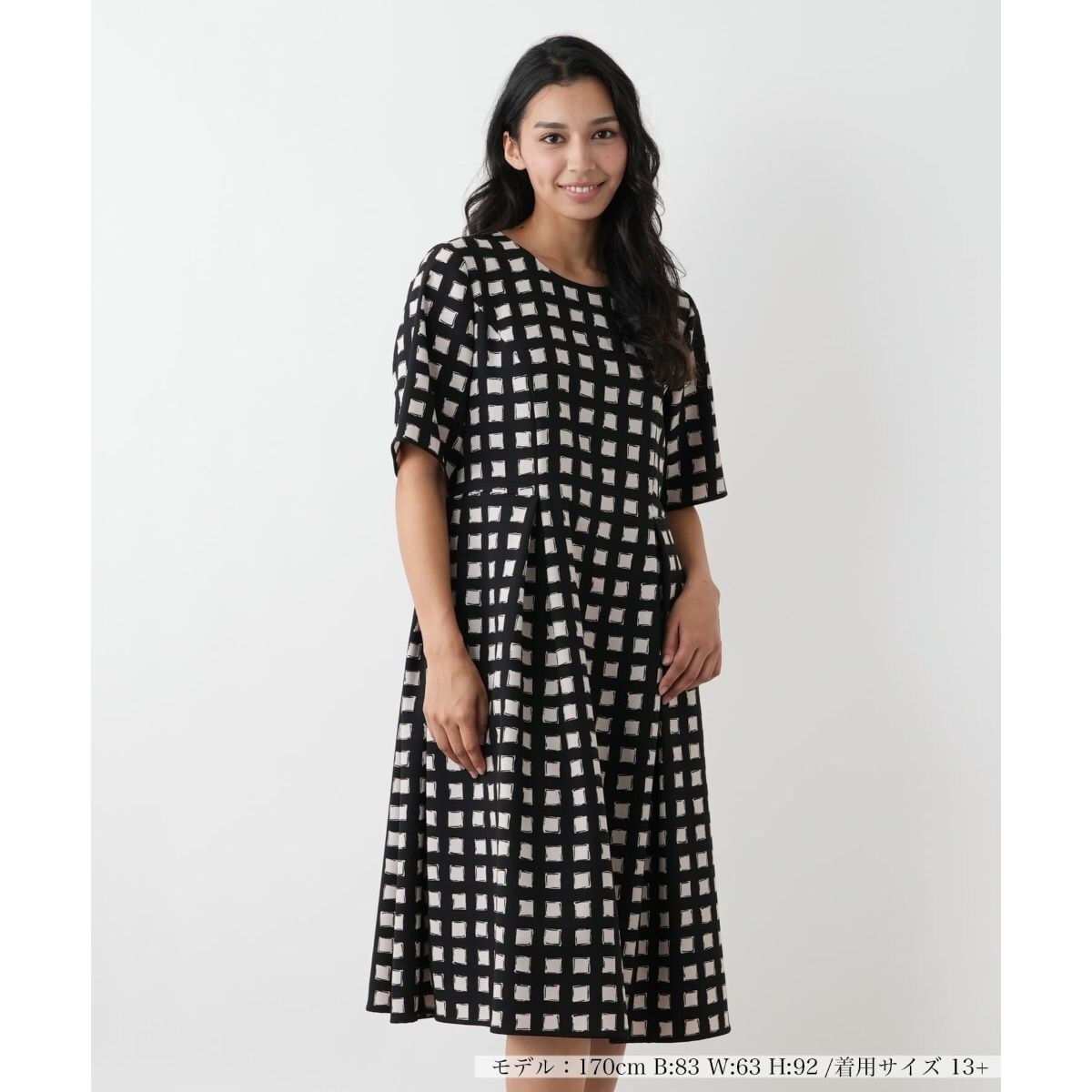 手描き風の格子柄がプリントされた生地を使い、フィットアンドフレアの美しいシルエットで仕上げたワンピース。ハイウエストで切り替えたウエストラインが、自然なスタイルアップを叶えます。袖部分は伸縮性と透け感のある素材で、見た目の軽やかさと快適な着心地を両立しました。一枚で女性らしいコーディネートが完成し、お呼ばれや食事会など、やや改まった場面にも対応できる上品な一着です。便利なポケット付き。