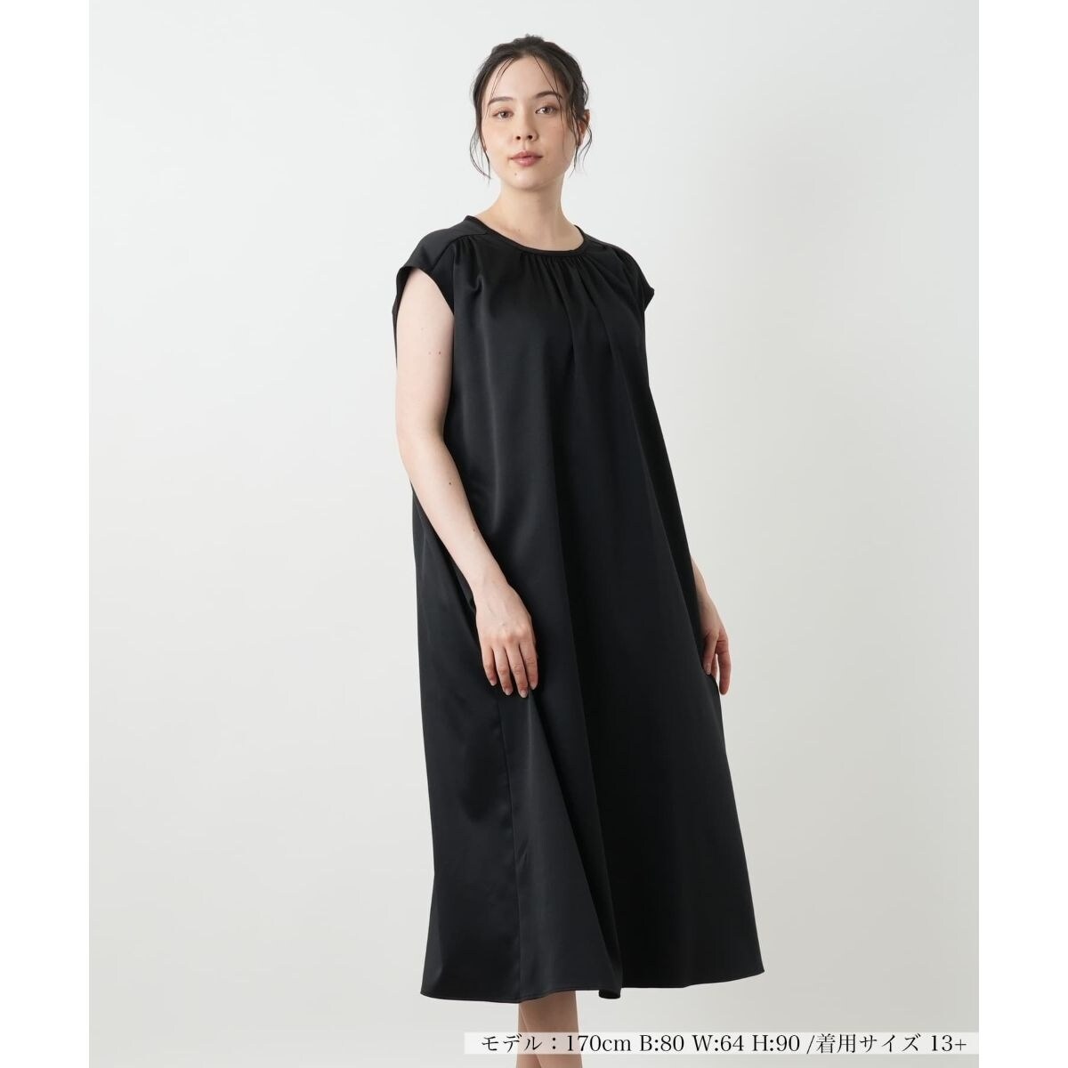 滑らかな手触りと上品な光沢を湛える生地を贅沢に使用したフレアワンピース。ネックラインに寄せたギャザーが豊かなドレープを生み出し、顔周りを優しく見せてくれます。後ろ姿を愛らしく演出するリボンディテールもポイントです。身体のラインを拾わない、ゆったりとしたAラインシルエットで着心地はストレスフリー。両サイドには、何かと便利なポケットをレイアウトしました。アクセサリーやシューズ次第で、普段使いからお出かけまで幅広いシーンに対応。ジャケットやカーディガンを羽織ればロングシーズン活躍します。