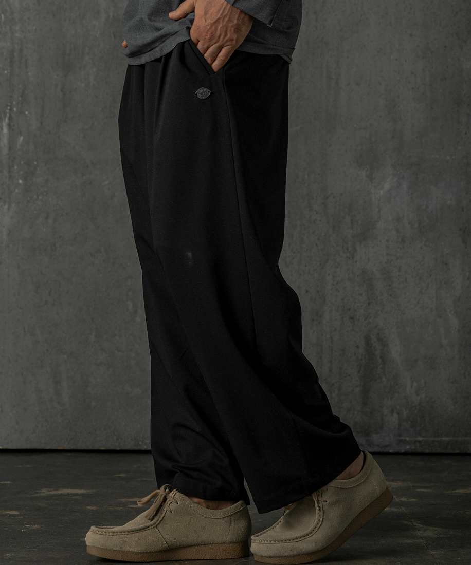 フラットなフロントタックとワイドな落ち感のあるシルエットは、動きやすさと快適さを追求。