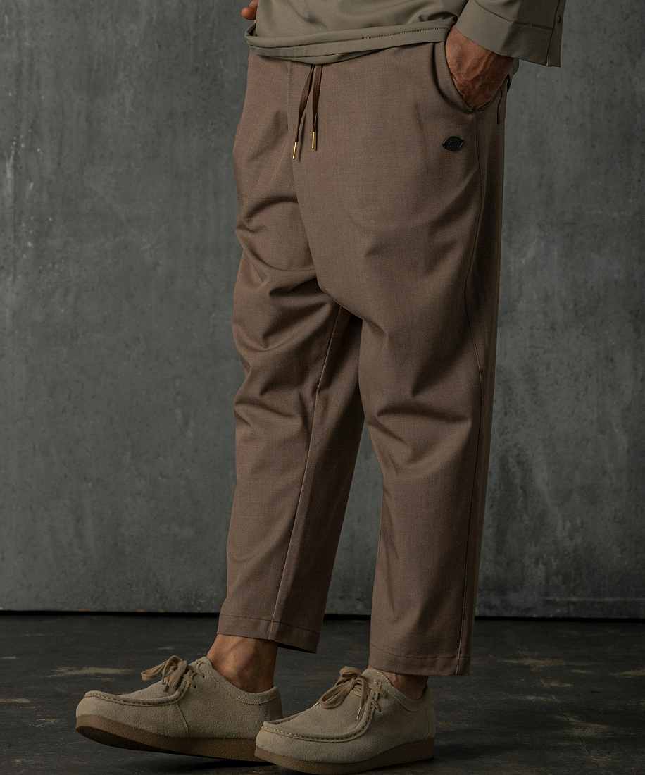 メタルチップが映えるテーパードシルエットパンツ。