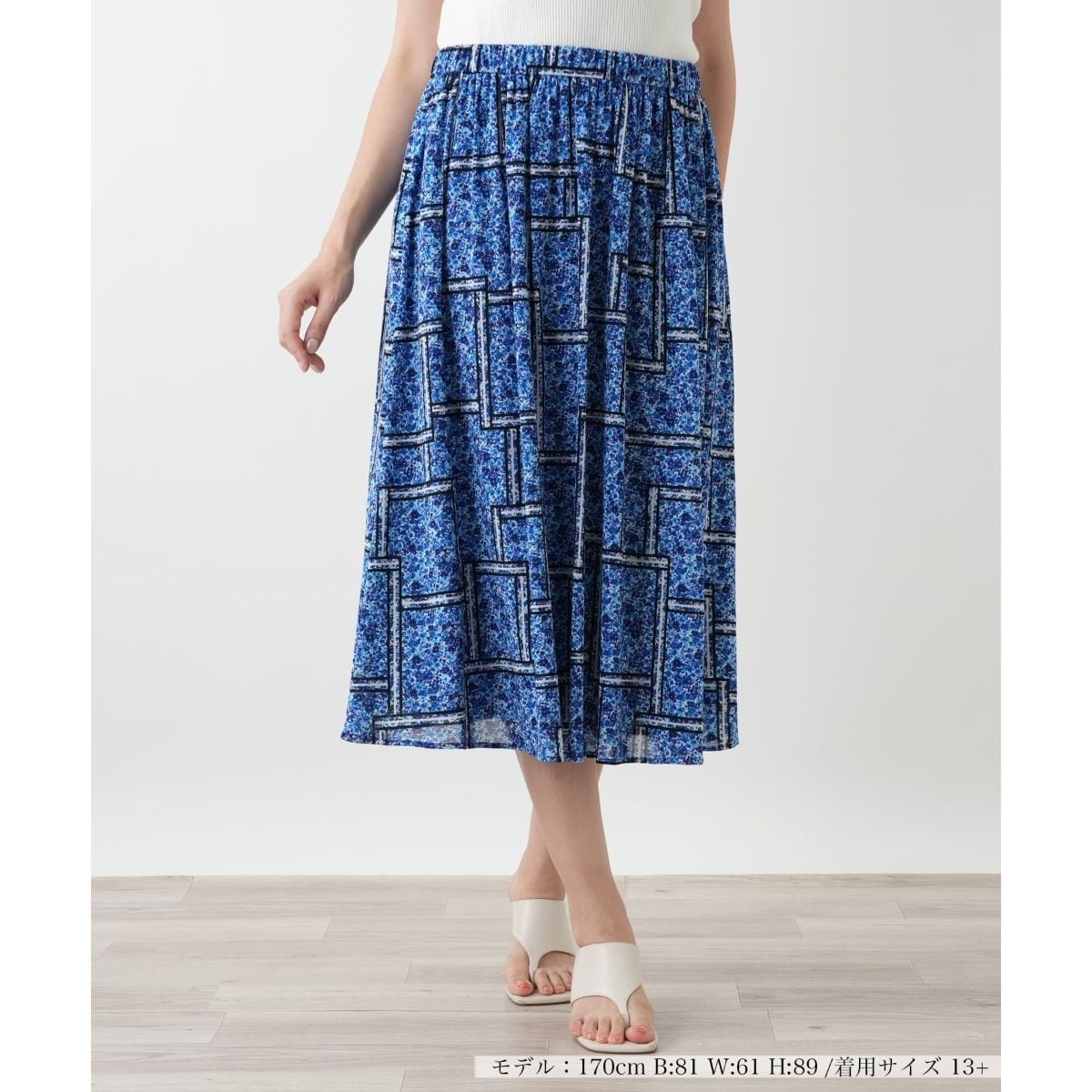 幾何学模様と繊細な小花柄を組み合わせたモダンなプリントが、ひときわ目を惹くフレアスカート。伸縮性に優れたパワーネット素材を使用しており、軽やかでストレスフリーな穿き心地が感じられる一枚。たっぷりと寄せたギャザーが生み出す美しいドレープが優雅に揺れて女性らしさを引き立てます。ウエストは総ゴム仕様で穿き心地も快適。同素材のトップスと合わせた、ワンピース見えするセットアップスタイルはもちろん、単品でシンプルなニットと合わせても素敵に着こなせます。