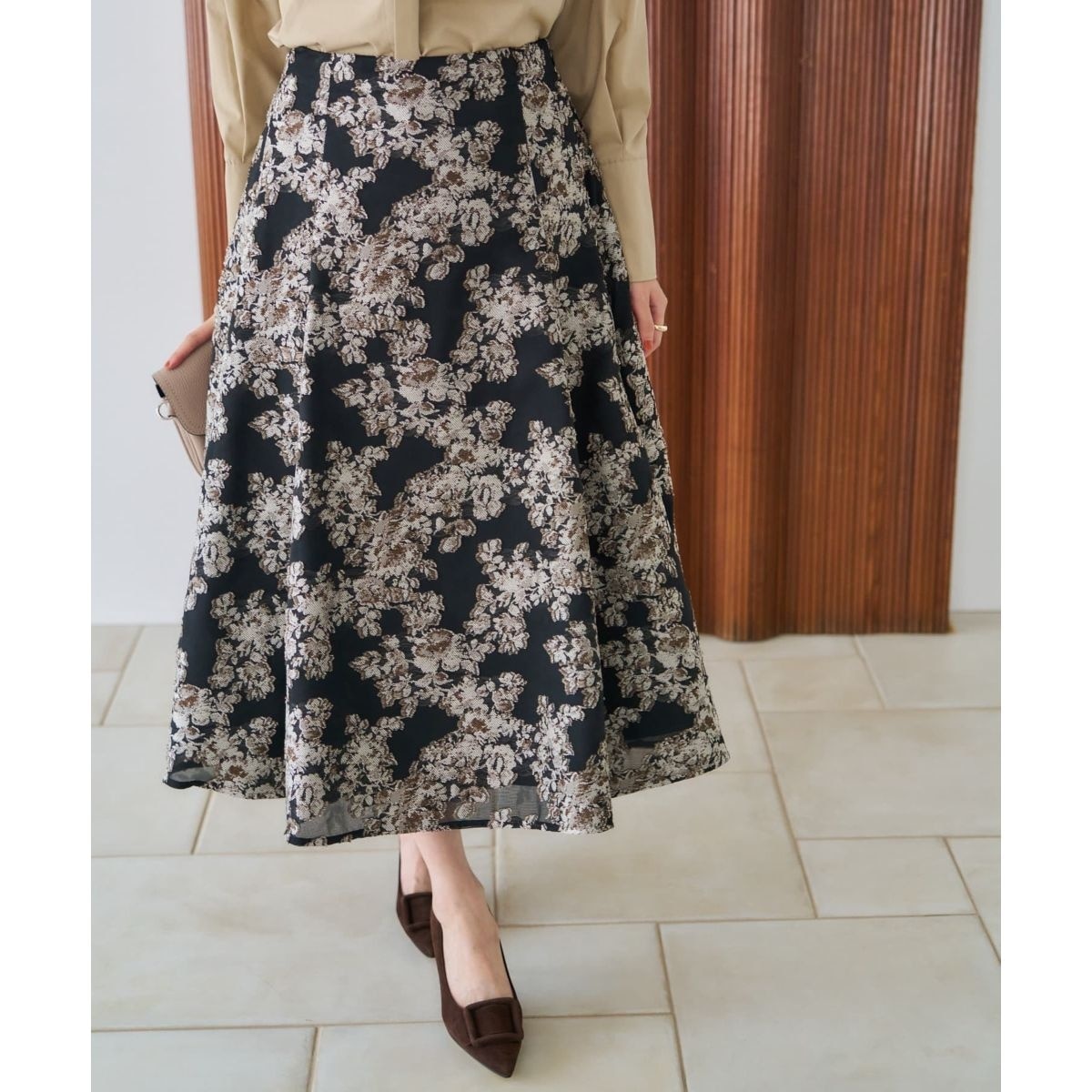 立体感のあるボタニカル柄の織り地が目を惹く、エレガントなロングスカート。光の当たり方によって生まれる陰影が、コーディネートに深みと高級感を加えます。優雅に揺れるフレアシルエットが女性らしい所作を演出。ウエストのフロント部分はすっきりさせ、後ろはゴム仕様にすることで快適な穿き心地を叶えつつ、トップスをインしても綺麗に見えるデザインに。秋のシンプルなニットに合わせるだけで、コーディネートが一気に華やぐ主役級のボトムスです。サイドホック&ファスナーにより開閉が可能。