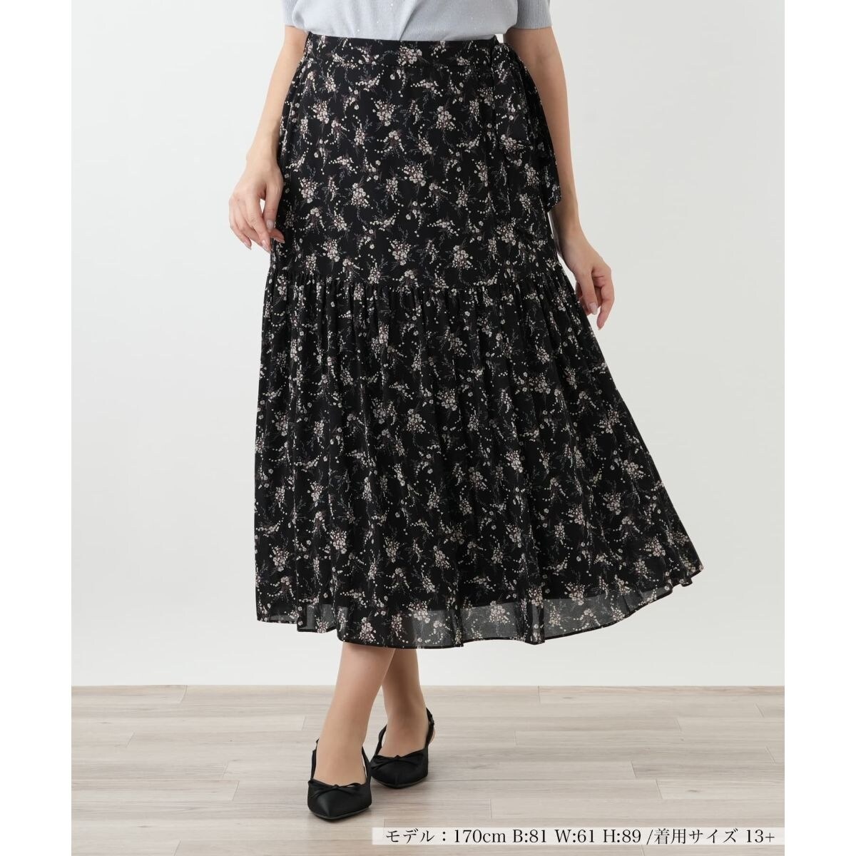ヴィンテージライクな花柄を散りばめた、華やかな雰囲気のロングスカート。裾に向かって豊かに広がる切り替えギャザーが、動くたびに優雅な揺れ感を演出。ウエストを飾るリボンも、女性らしさを引き立てる甘いエッセンスに。軽やかな素材感で秋のコーディネートをドラマティックに彩る、主役級の一枚です。コンパクトなトップスを合わせるだけで、上品なスタイルが完成します。