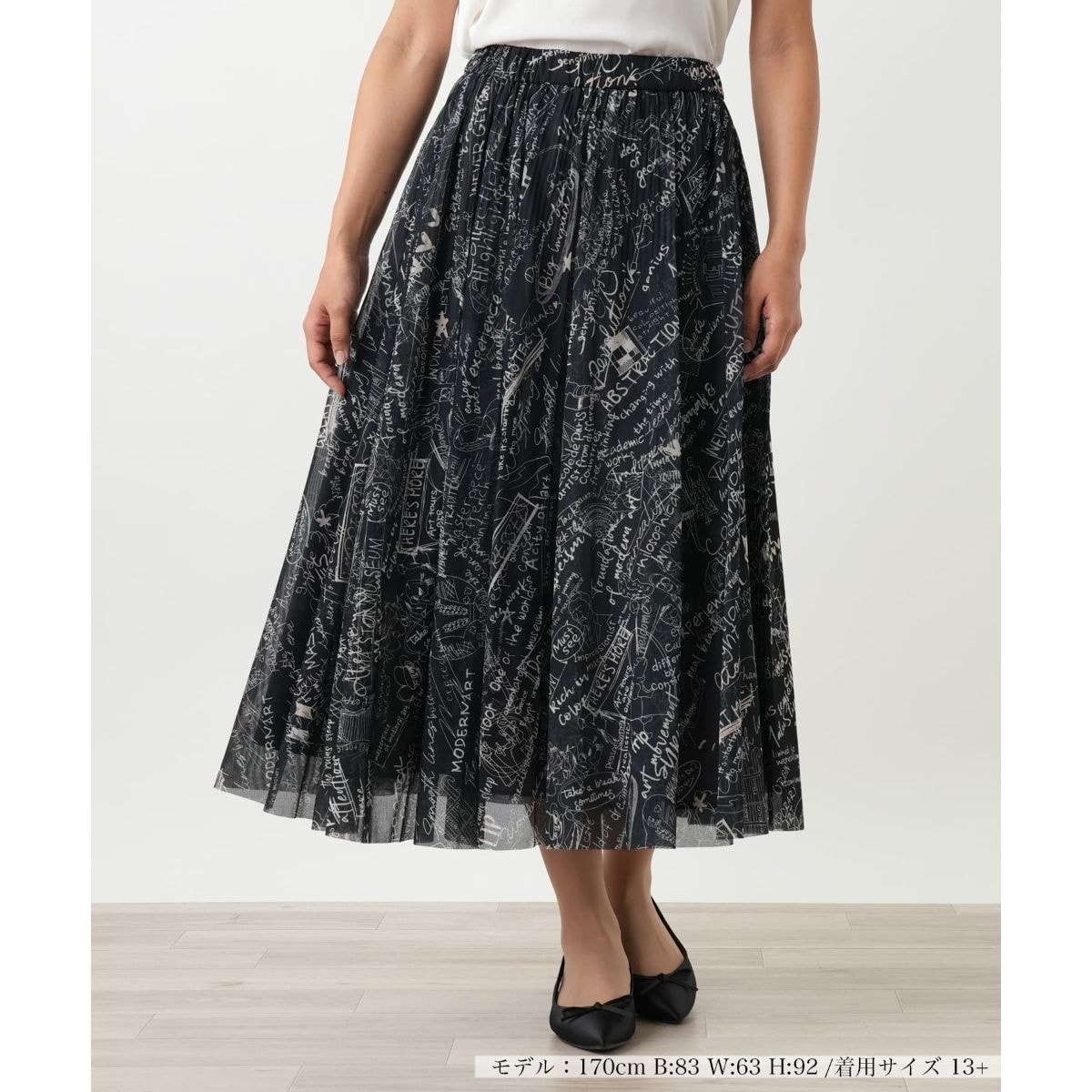 手書き風のプリントを、エアリーなチュール素材にのせた主役級のフレアスカート。ふんわりと揺れるドラマティックなシルエットと、裾のカットオフデザインが、甘さの中に程よい抜け感をプラス。ウエストは楽な総ゴム仕様なうえ、裏地にも伸縮性を持たせることで、ストレスフリーな穿き心地を実現しました。シンプルなトップスを合わせるだけで、エッジの効いたフェミニンルックが完成します。