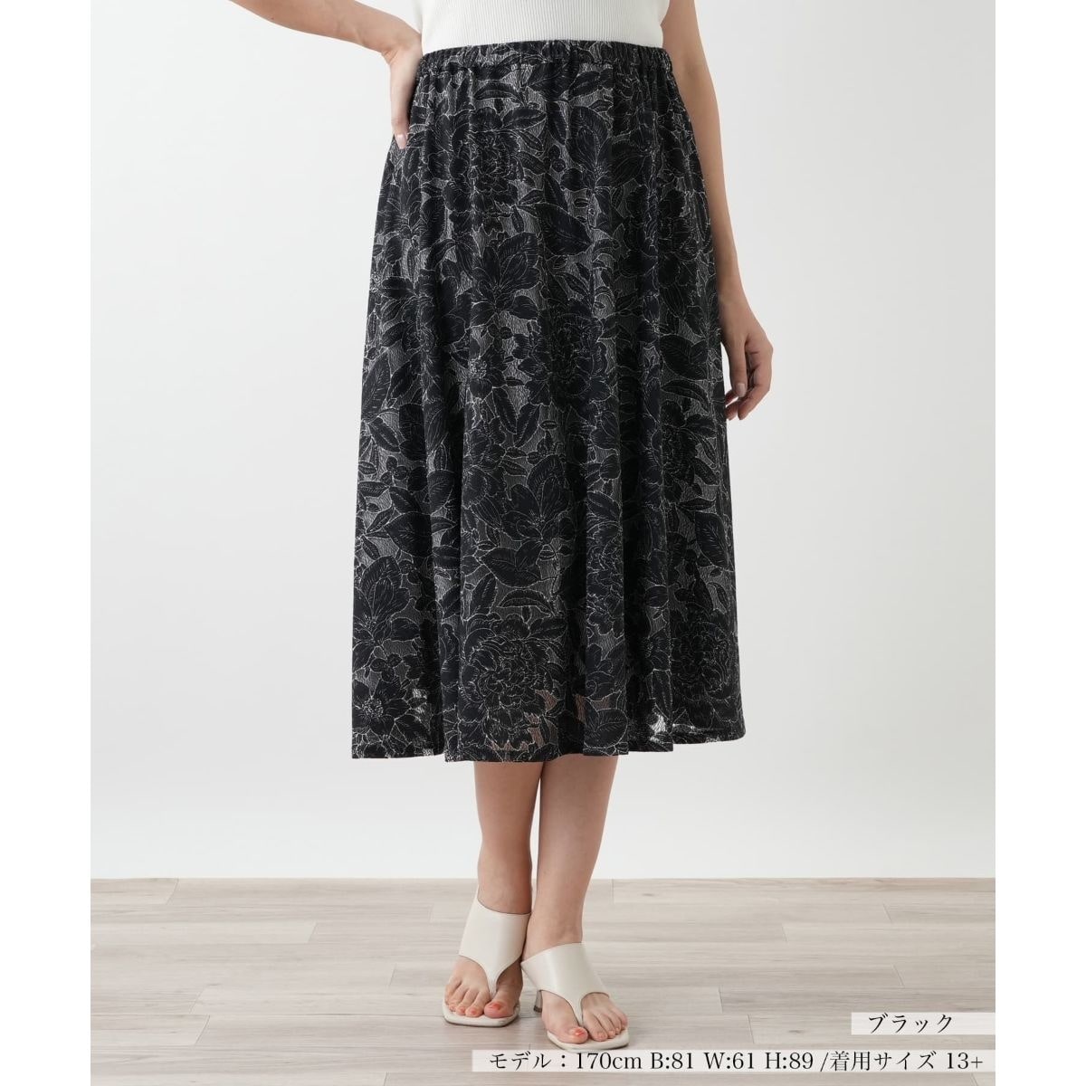 上品な透け感のカットワーク刺繍が、エレガントな雰囲気を醸し出すフレアスカート。繊細な柄がシンプルなトップスに合わせるだけで、着こなしを華やかに引き立てます。ふんわりと広がるフレアシルエットが女性らしさを演出しつつ、気になる腰回りをさりげなくカバー。ウエストは総ゴム仕様でリラックスした穿き心地。ブラウスと合わせてきれいめに、Tシャツと合わせてカジュアルにと幅広いスタイリングが楽しめます。ご自宅で手洗いできるのも嬉しいポイント。