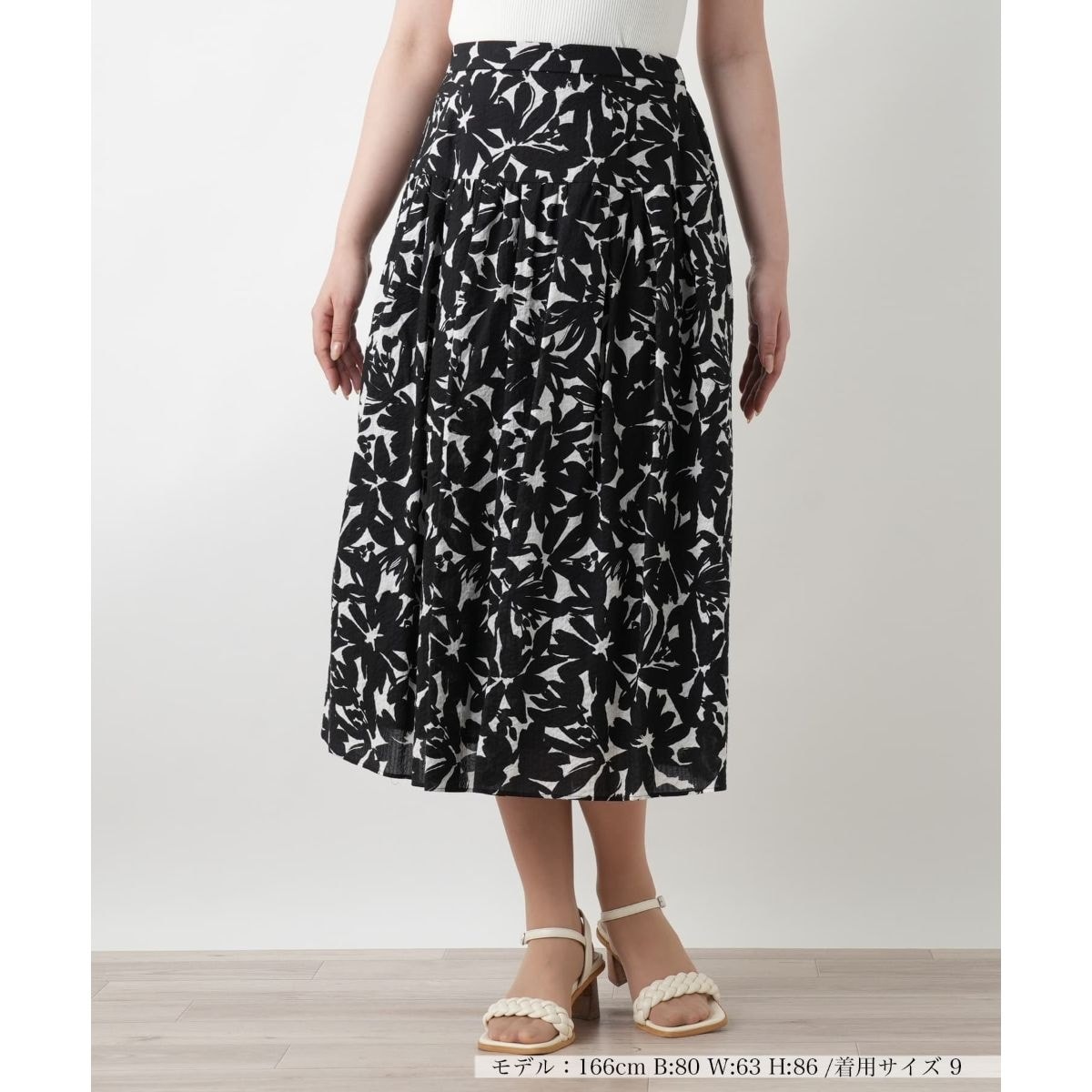 季節のスタイリングに優雅な動きを添える、フラワー柄のミモレ丈フレアスカート。大胆に施されたフラワープリントが印象的な一枚。モノトーン配色が上品で、トップスを選ばずにコーディネートしやすいアイテムです。ウエストまわりはすっきりとシェイプし、裾にかけてふんわりと広がるシルエットが女性らしさを引き立てます。バックウエストはゴム仕様で快適なフィット感に。サイドにはホック&ファスナーを備え、着脱もスムーズに行えます。