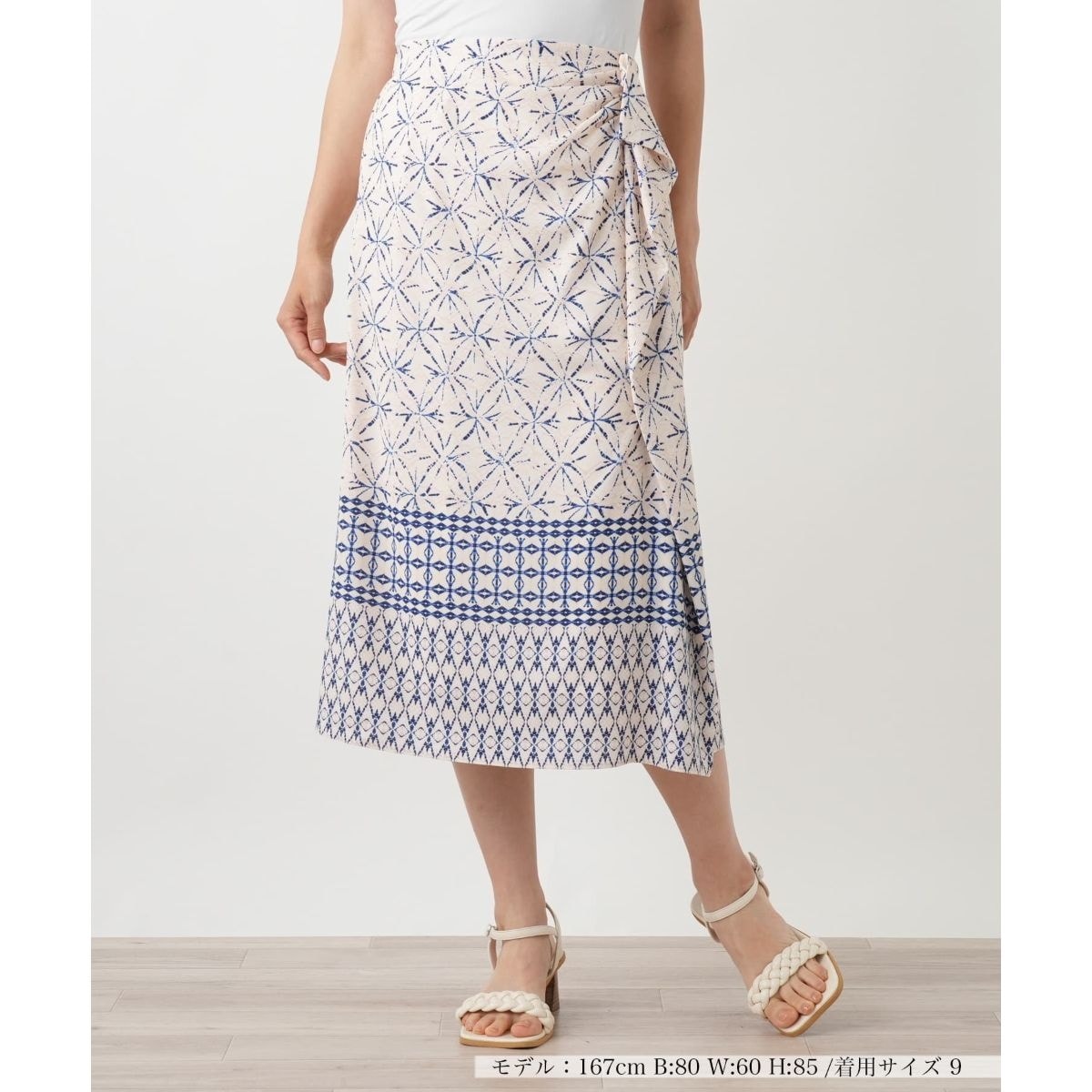 レトロなムード漂う幾何学柄を組み合わせた、ミディ丈のラップ風スカート。ウエスト部分のタック使いと、斜めに重なるようなフロントのルックスがアクセントになり、立体感のあるシルエットを描きます。すっきりとしたIラインを基調にしながらも、裾にかけてほどよく広がるフォルムで、動きに合わせて軽やかに揺れる印象に。ウエストは後ろゴム仕様で心地よくフィット。無地のトップスと合わせるだけで、コーディネートに個性が加わります。ホック&ファスナーにより開閉が可能。