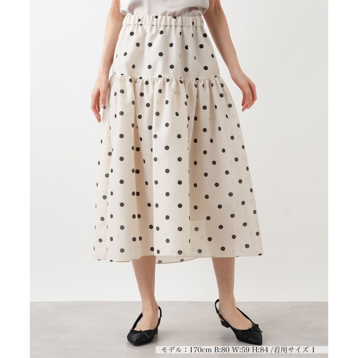 軽やかな薄手の生地にシンプルなドット柄を散りばめスカート。甘くなりすぎないデザインで、大人のカジュアルにも程よくなじむ一枚です。ウエストは総ゴム仕様で、締めつけ感のない快適なはき心地を実現。タックインすれば自然とウエストマークが際立ち、脚長見せ効果も期待できます。裾に向かってふんわりと広がるシルエットが、歩くたびに優雅な揺れ感を生み、女性らしいムードを引き立てます。Tシャツやブラウスを合わせるだけで、季節らしい着映えるスタイルが完成します。