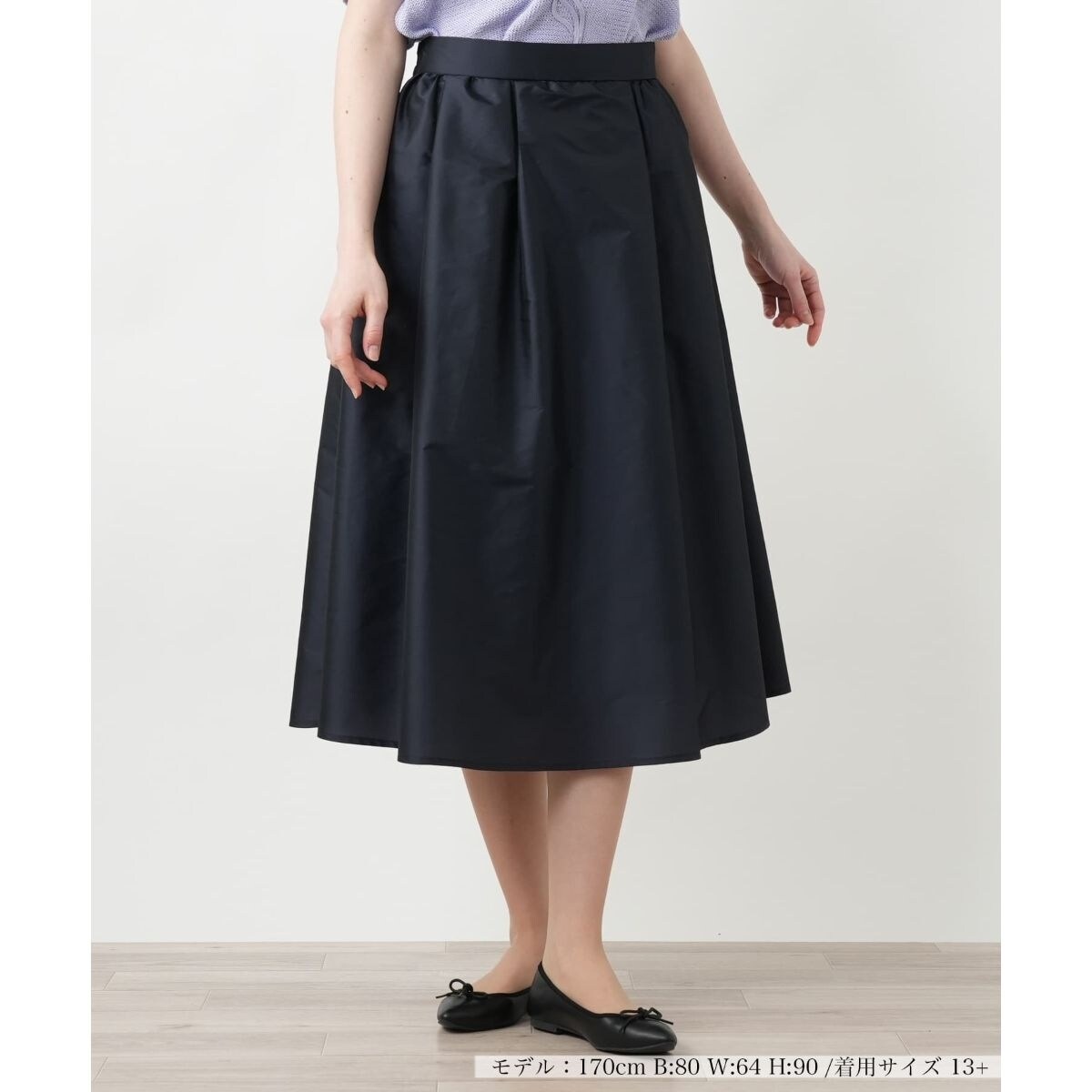 上品な光沢を湛える程よくハリのある生地で仕立てた、大人の女性らしいエレガントな佇まいのフレアスカート。ウエストは程よくシェイプされ、裾に向かって大胆に広がるドラマティックなシルエットがインパクトたっぷり。立体感のあるギャザーがメリハリを強調するので、タックインすればスタイルアップ見せ効果も期待できそうです。バックウエストはゴム仕様となっており、快適なフィット感を実現します。サイドホック&ファスナーにより開閉が可能です。