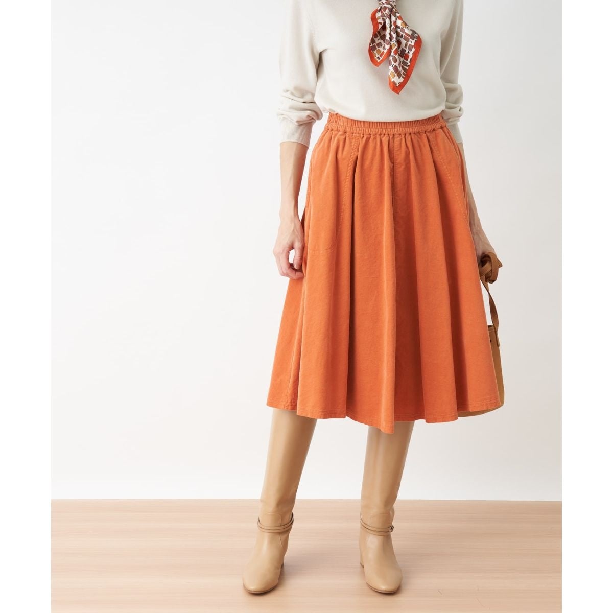ギャザーをたっぷりと施し、ふっくらと広がるフレアシルエットでデザインしたミディ丈スカート。やや薄手のコットンベースの生地に製品洗いをかけることで独特の風合いを醸し出しています。さらにストレッチ素材を混紡し、スムーズな足捌きにも配慮。ウエストは総ゴム仕様で心地よいフィット感をもたせました。足元にブーツを合わせれば、今シーズンらしいスパイシーな雰囲気に仕上がります。