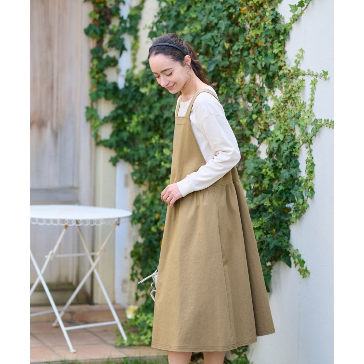 コットンのナチュラルな風合いが引き立つジャンパースカート。ウエスト位置に切り替えを施したデザインがスタイルアップ見せ効果を叶えます。ニットのハイネックトップスを合わせれば、見た目にも暖かくほっこりとしたスタイリングに。春先には軽やかなカットソーやシャツとのレイヤリングで爽やかさをプラスして、シーズンに合った軽快な着こなしが楽しめます。シンプルながらも細部にこだわったデザインで、カジュアルから少しきれいめなスタイルまで幅広く対応。バックストラップはボタン調節が可能です。