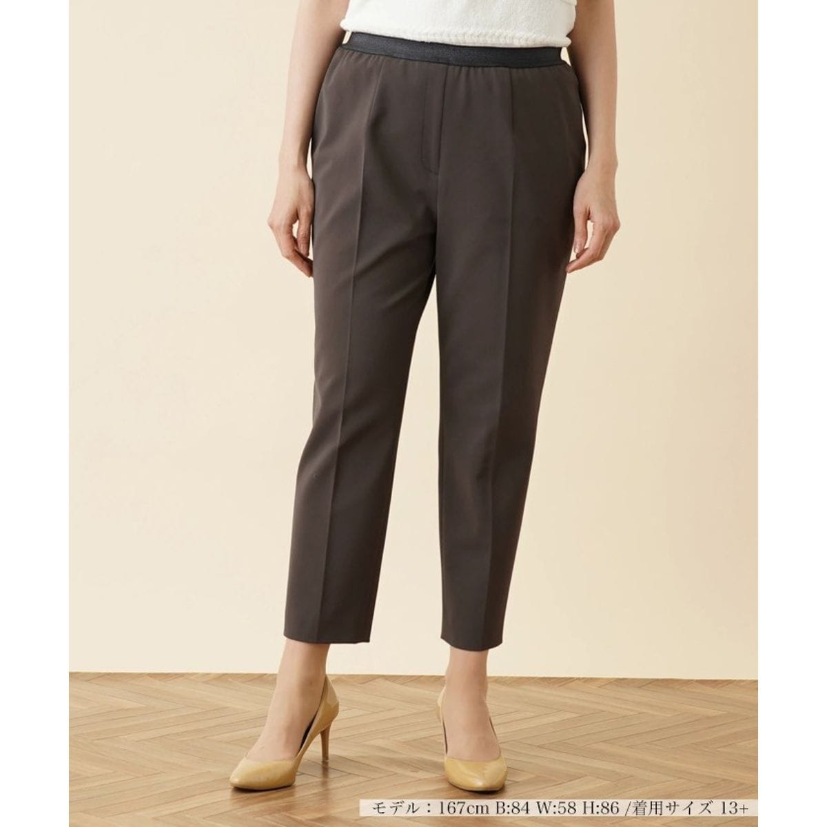 撥水加工を施した、細身のクロップドパンツ。スマートなテーパードシルエットとセンタープレスが、レッグラインのすっきり見せを叶えてくれます。ウエスト周りはラメがたっぷりと散りばめられたゴムで切り替え、アクセントを加えるとともに心地よいフィット感をもたせました。ストレッチが効いているので穿き心地も快適。シンプルでキレイめにもカジュアルにも活躍する、着回しに便利なアイテムです。
