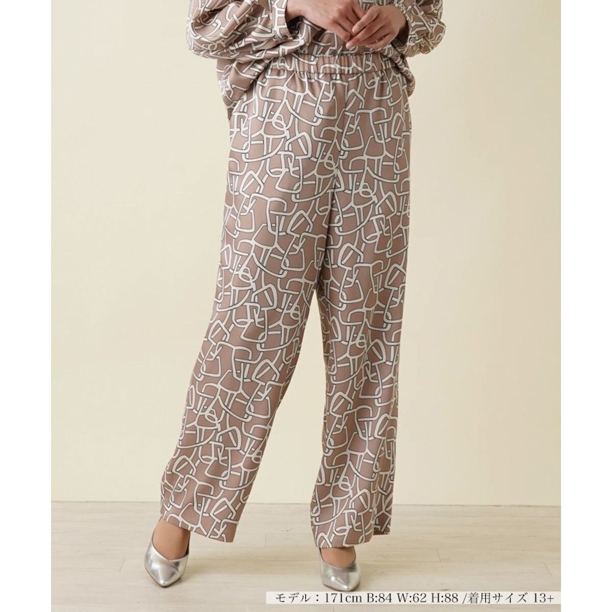 ジオメトリックな総柄を取り入れたインパクトたっぷりのワイドパンツ。光沢のあるつるりとしたポリエステル素材は高級感があり上品見えするアイテムです。同柄のトップスとセットアップで着こなすとファッション感度の高いコーディネートが完成します。