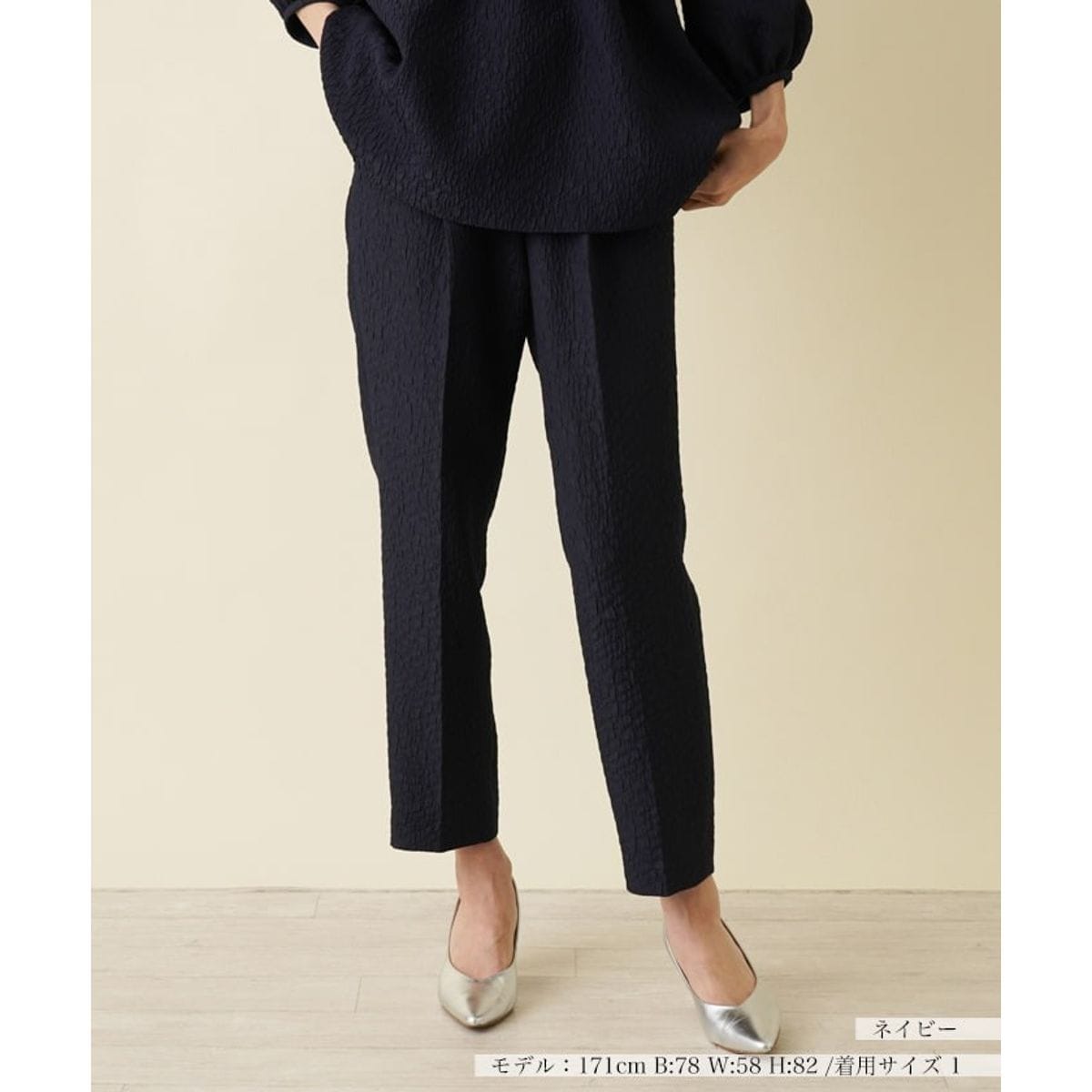表面感のある生地の風合いが美しいセンタープレスパンツ。タックテーパードに仕上げたハリのある細身のシルエットがエレガントムードの際立つ1枚。同デザインのブラウスとセットアップで着こなすのも素敵です。